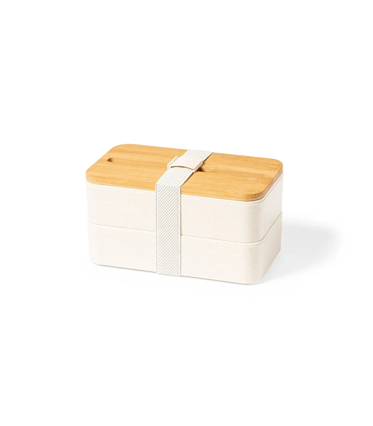 Original set de fiambreras de 1,4l en resistente material PP veteado libre de BPA. Original tapa de bambú con soporte para smartphone integrado. Dos compartimentos, cada uno de 700 ml de capacidad y compartimento interior con tenedor, cuchara y cuchillo.