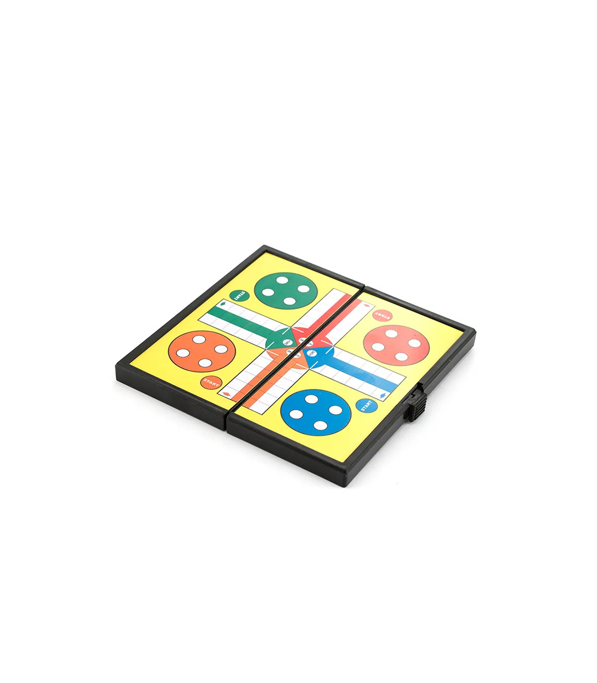 Juego de mesa plegable con superficie metálica y fichas magnéticas. Disponibles parchís, tres en raya y damas. Presentado en caja individual.