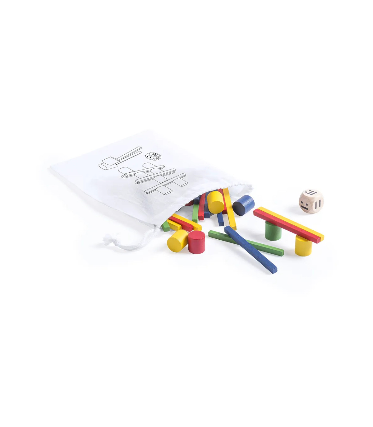 Juego de habilidad con 33 piezas de madera pintada en vivos colores. Con dado y presentado en funda de tela con cordones auto cierre.