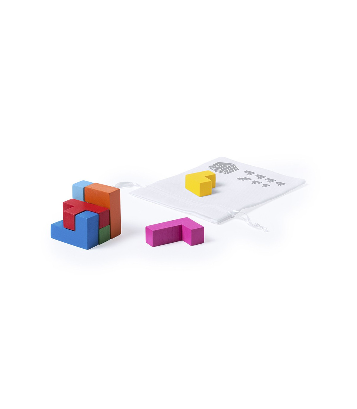 Juego de habilidad 3D en madera con piezas de vivos colores. Presentado en funda individual de poliéster para fácil marcaje.