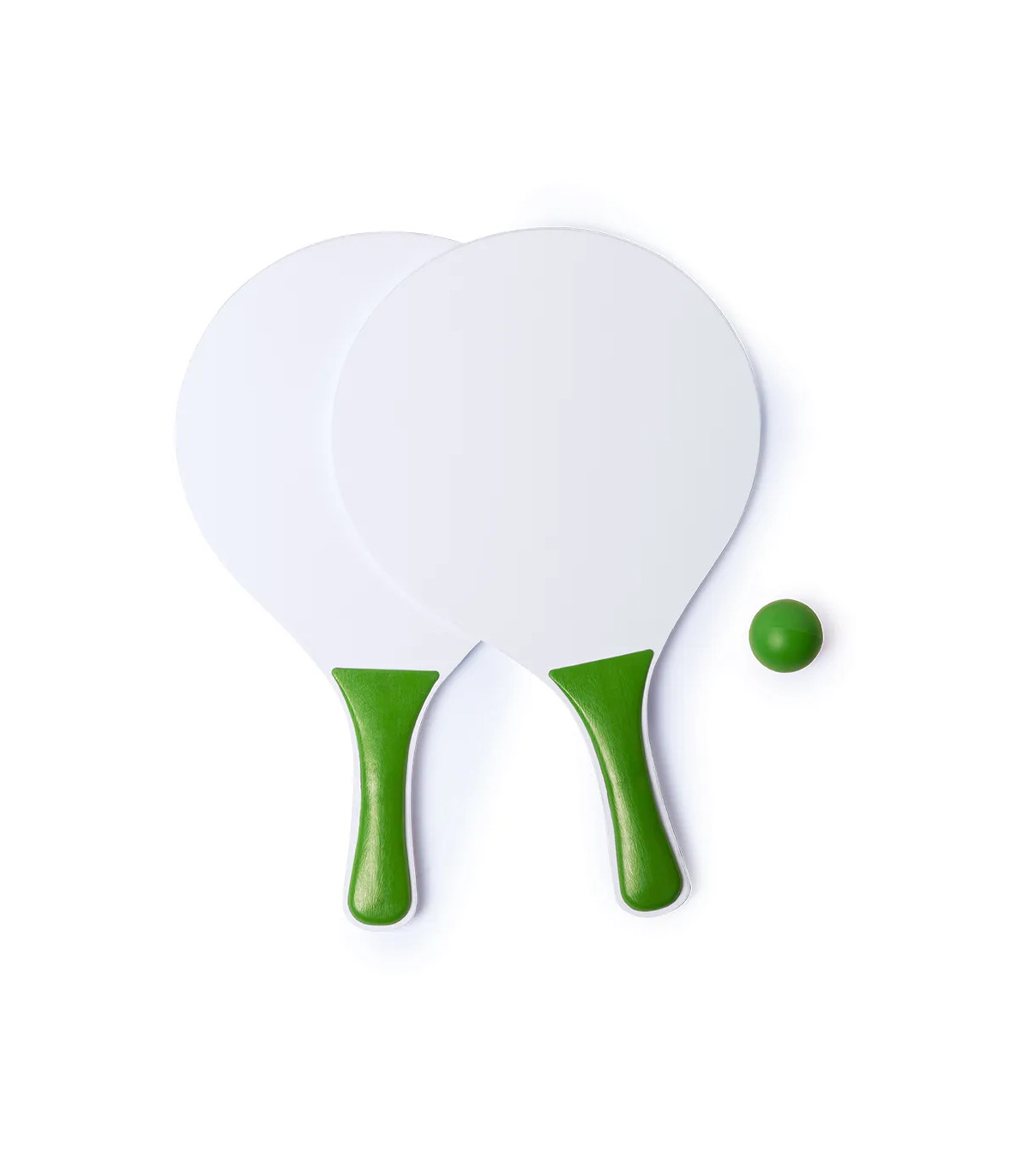 Par de palas de playa en madera natural blanca. Con mango reforzado en variada gama de vivos colores. Presentadas en bolsa redecilla con pelota a juego.