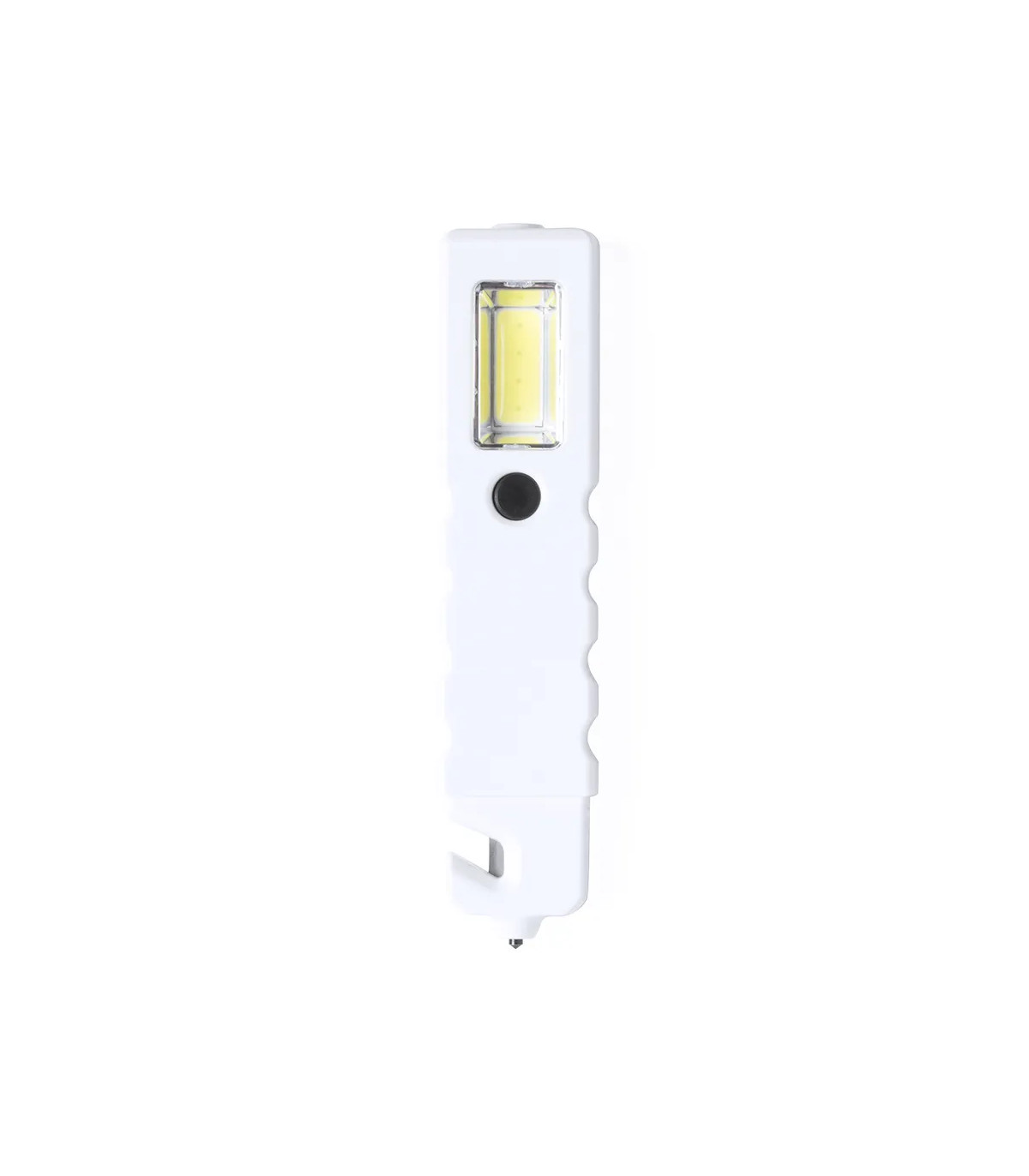 Martillo de emergencia 3 en 1 con linterna led y 4 luces COB con 3 modos de iluminación. Con superficie imantada y cuchilla corta cinturones.