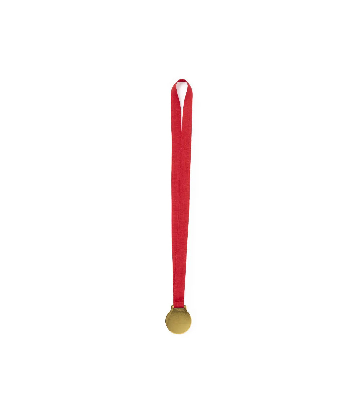 Medalla metálica de acabado dorado liso, con cinta de poliéster en rojo y especialmente diseñada para marcaje en impresión digital.