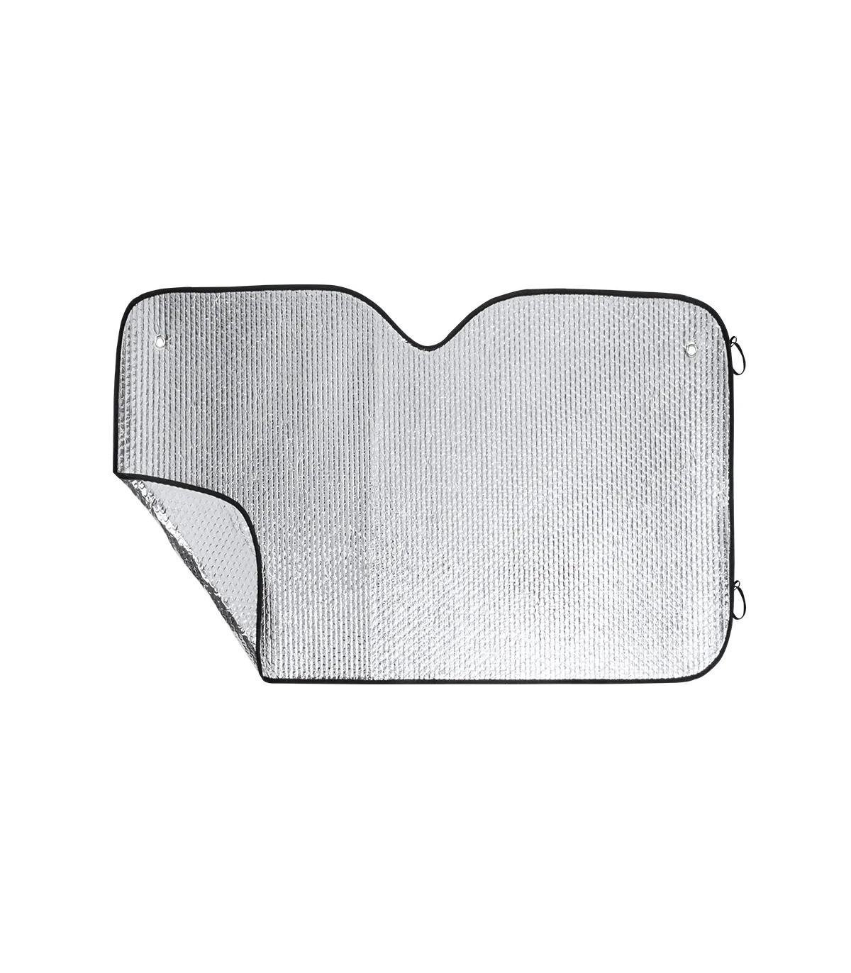 Parasol en aluminio con burbuja en ambas caras en color plateado de acabado metalizado con ribetes en color negro. De tamaño 130x80cm, con argollas metálicas de refuerzo, cintas elásticas para plegado, dos ventosas para ajuste en luna y presentación desplegado en plancha para fácil impresión.