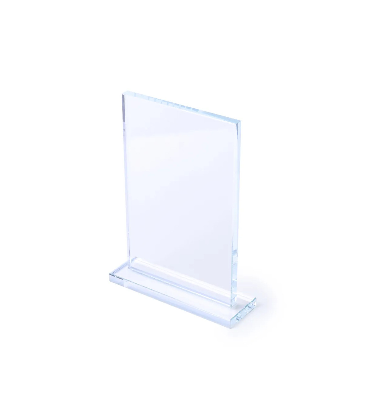 Placa trofeo de grueso cristal con elegante diseño rectangular y resistente base. Especialmente diseñada para marcaje a láser y presentada en estuche de protección individual.