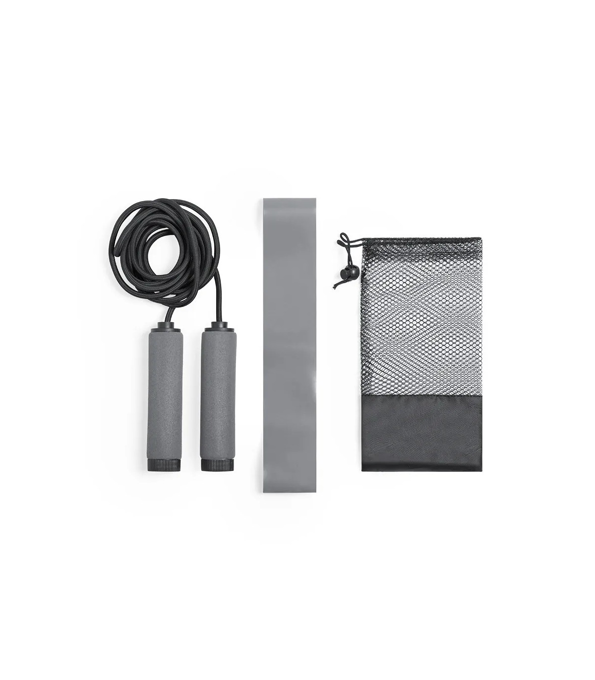 Set de goma elástica y comba para los más deportistas. Incluye: 1 cinta de 25x5 cm fabricada en resistente material TPE y resistencia media 1 comba de 260 cm, con mangos en resistente material HIPS forrados en EVA. Presentado en funda de poliéster con