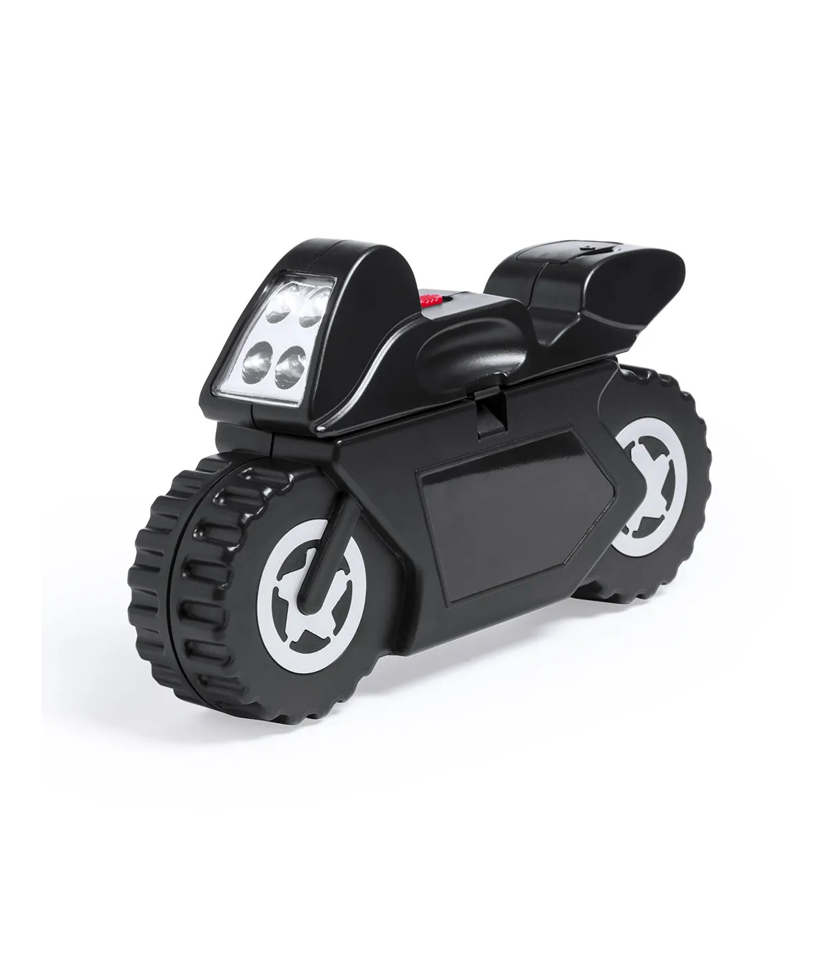 Set de herramientas de 14 accesorios en resistente estuche con diseño de moto, con linterna de 4 ledes integrada. Incluye set de destornilladores de precisión, herramienta de fijación, cabezales destornilladores planos y de estrella y llaves para tuercas de cabeza hexagonal. Pilas de botón incluidas. Presentado en caja individual.
