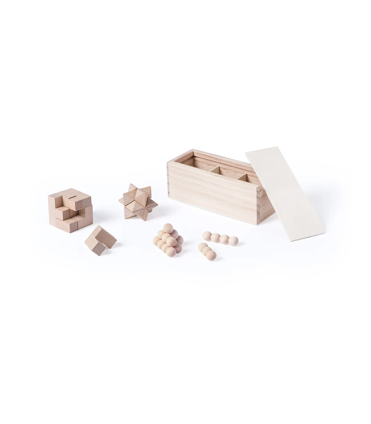 Adictivo set de 3 juegos de habilidad en madera natural. Presentado en caja de madera con compartimentos interiores y tapa deslizante.