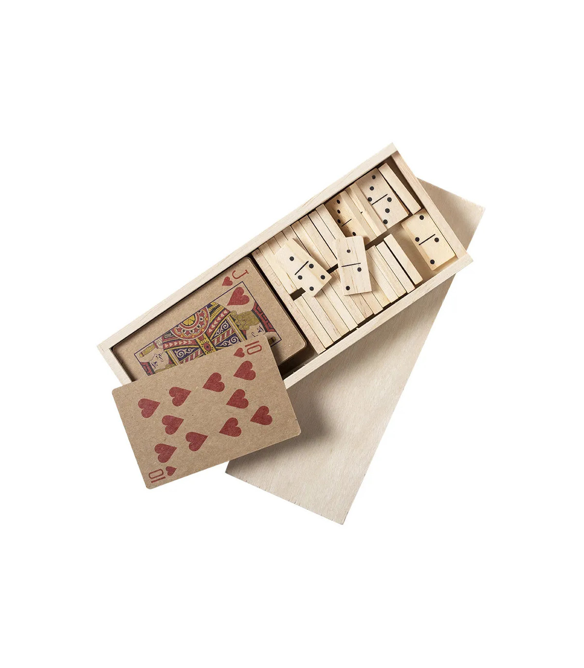 Set de juegos de línea nature. Incluye baraja de naipes francesa en cartón reciclado y dominó en madera. Set presentado en estuche de madera con compartimentos individuales para cada juego y tapa con apertura deslizante.