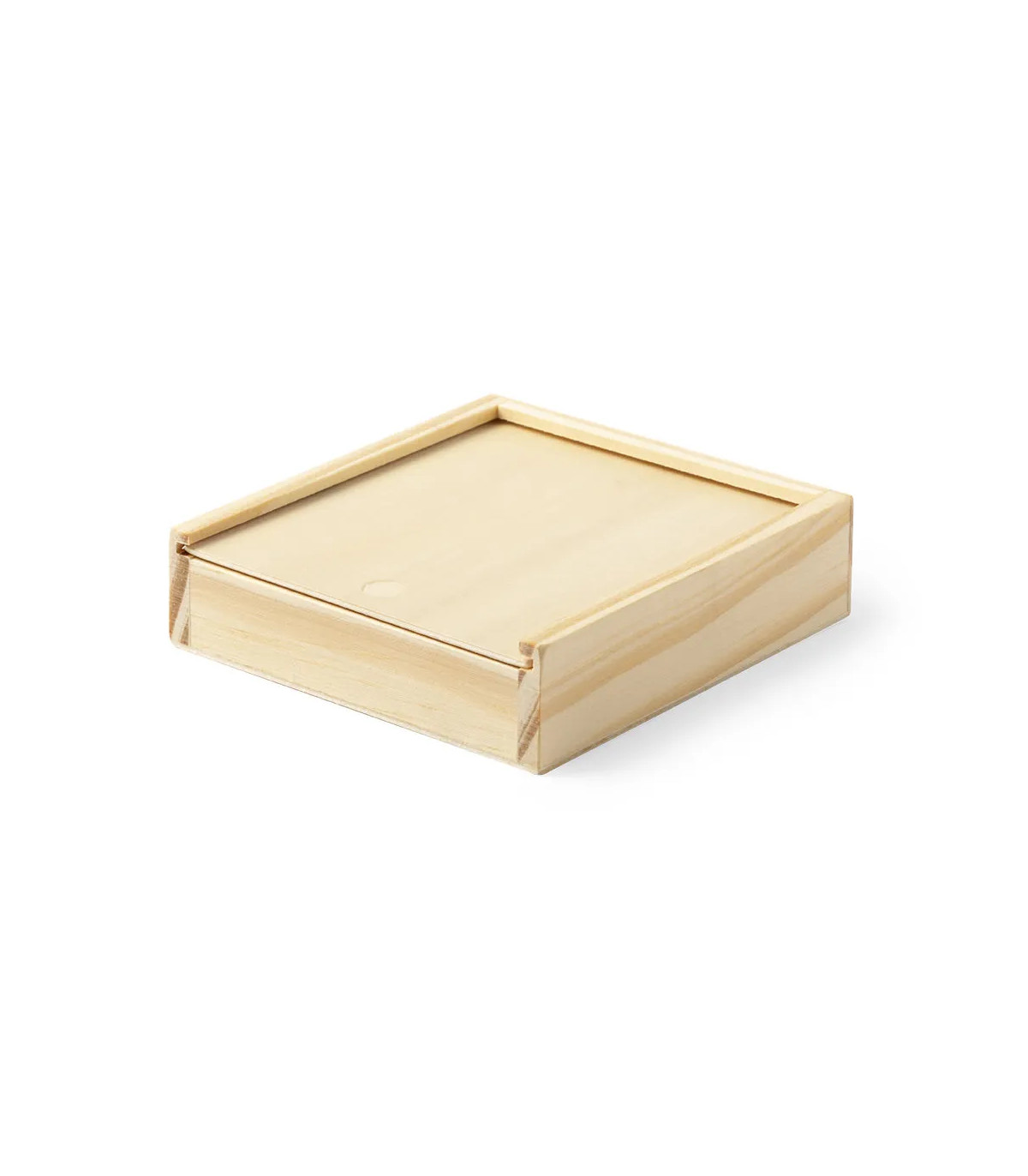 Set de juegos con baraja francesa y dados de madera, presentado en estuche individual de madera con tapa deslizante.