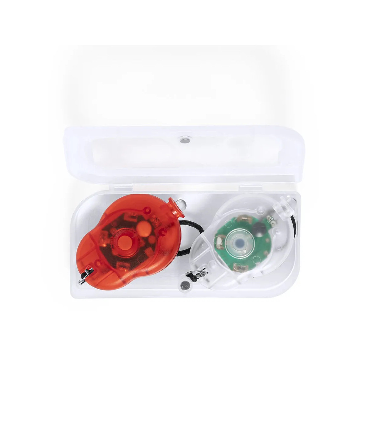 Set de luces de seguridad led para bici. Incluye 2 piezas, con dos posiciones de luz y presentadas en resistente estuche individual con cierre magnético. Alimentación a pilas de botón (incluidas).