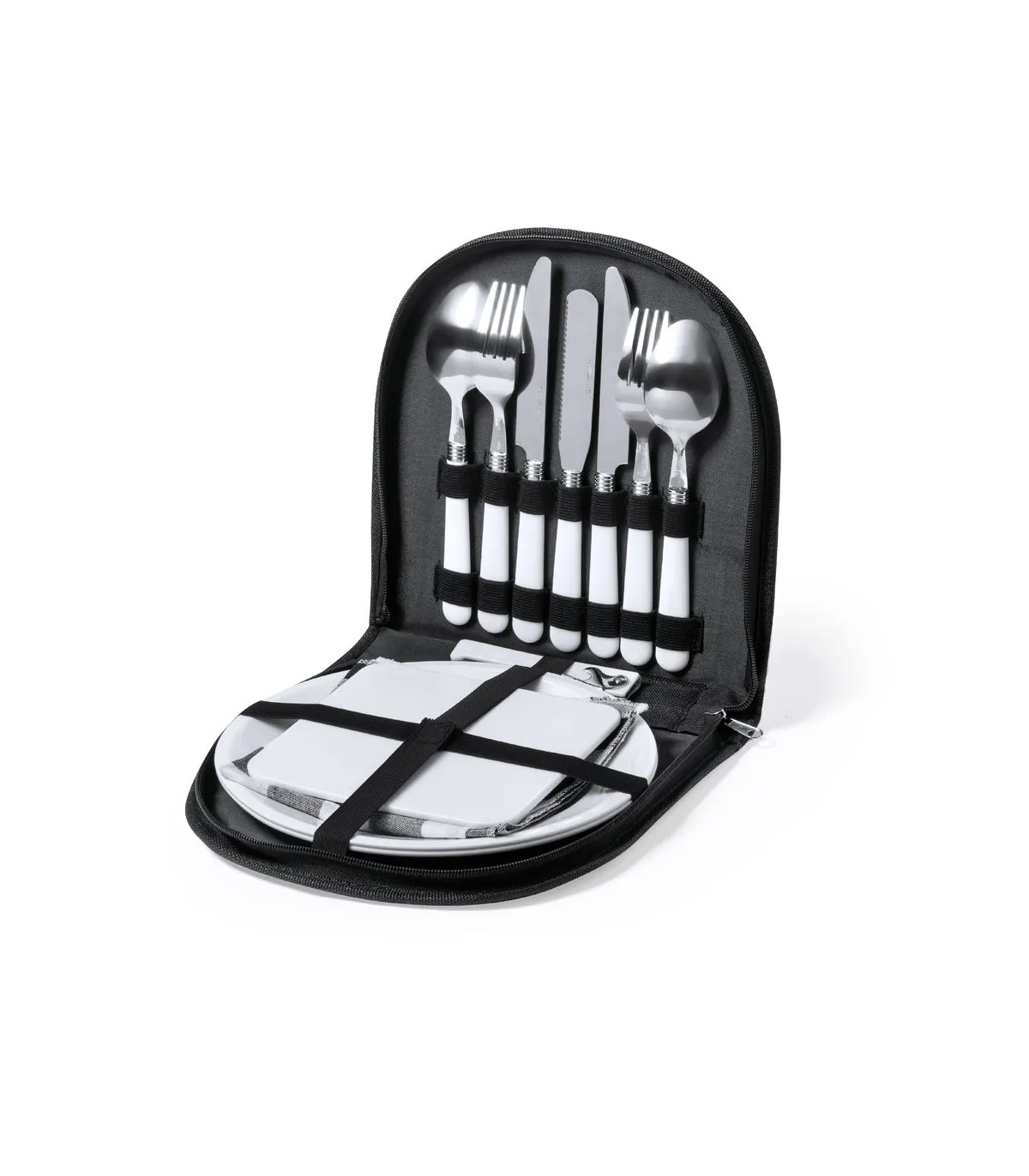 Original set de picnic de 2 servicios. Presentado en resistente funda 600D RPET, con cierre de cremallera, asa de transporte y etiqueta exterior con distintivo RPET. Interior reforzado, con compartimentos para los diferentes accesorios. Contenido: 2 cucharas, 2 cuchillos y 2 tenedores en acero inox con mango en PP blanco 2 platos en PP blanco de 23 cm de diámetro. 2 servilletas en tela de 29 x 29 cm. Con diseño retro en patrón a cuadros y en combinación tonos negros, grises y blancos. Tabla de corte y presentación de 15 x 15 cm, en PP blanco. El material RPET de la funda se elabora a partir de plástico reciclado, para así fomentar la reutilización de residuos plásticos y ayudar a la sostenibilidad del planeta.