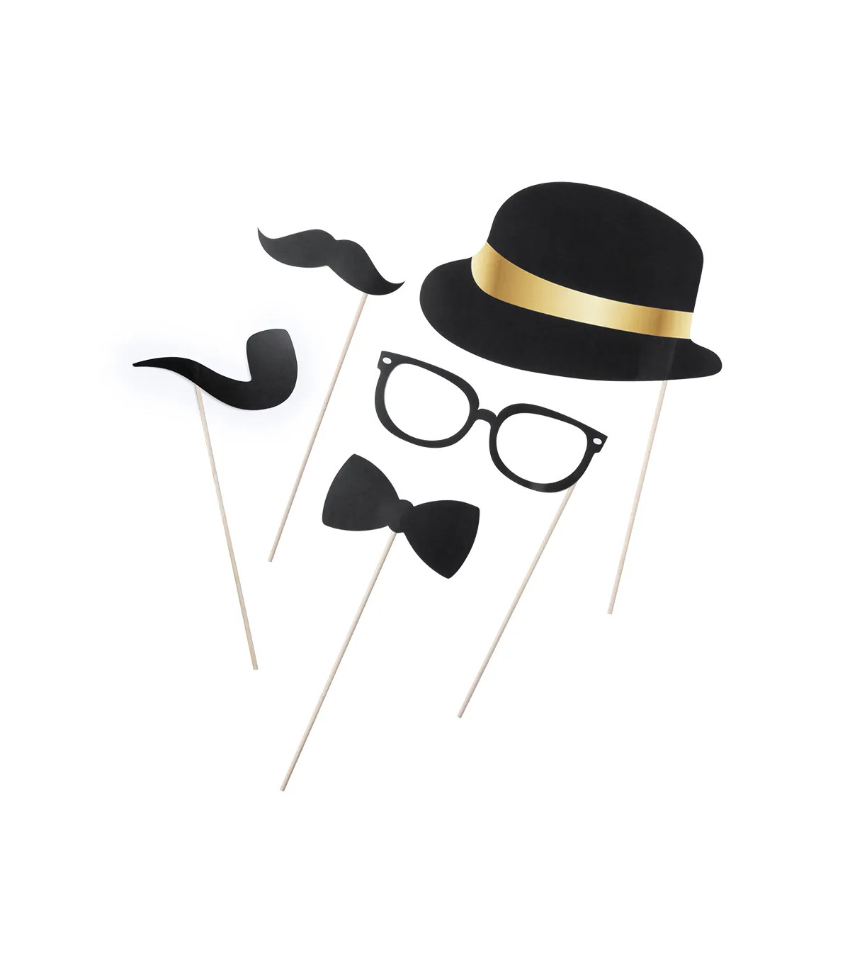 Set selfie de 5 piezas con divertidos accesorios sombrero, pipa, bigote, palomita y gafas. En papel de alto gramaje con mango de madera. Presentado en atractiva bolsa de diseño con auto cierre.