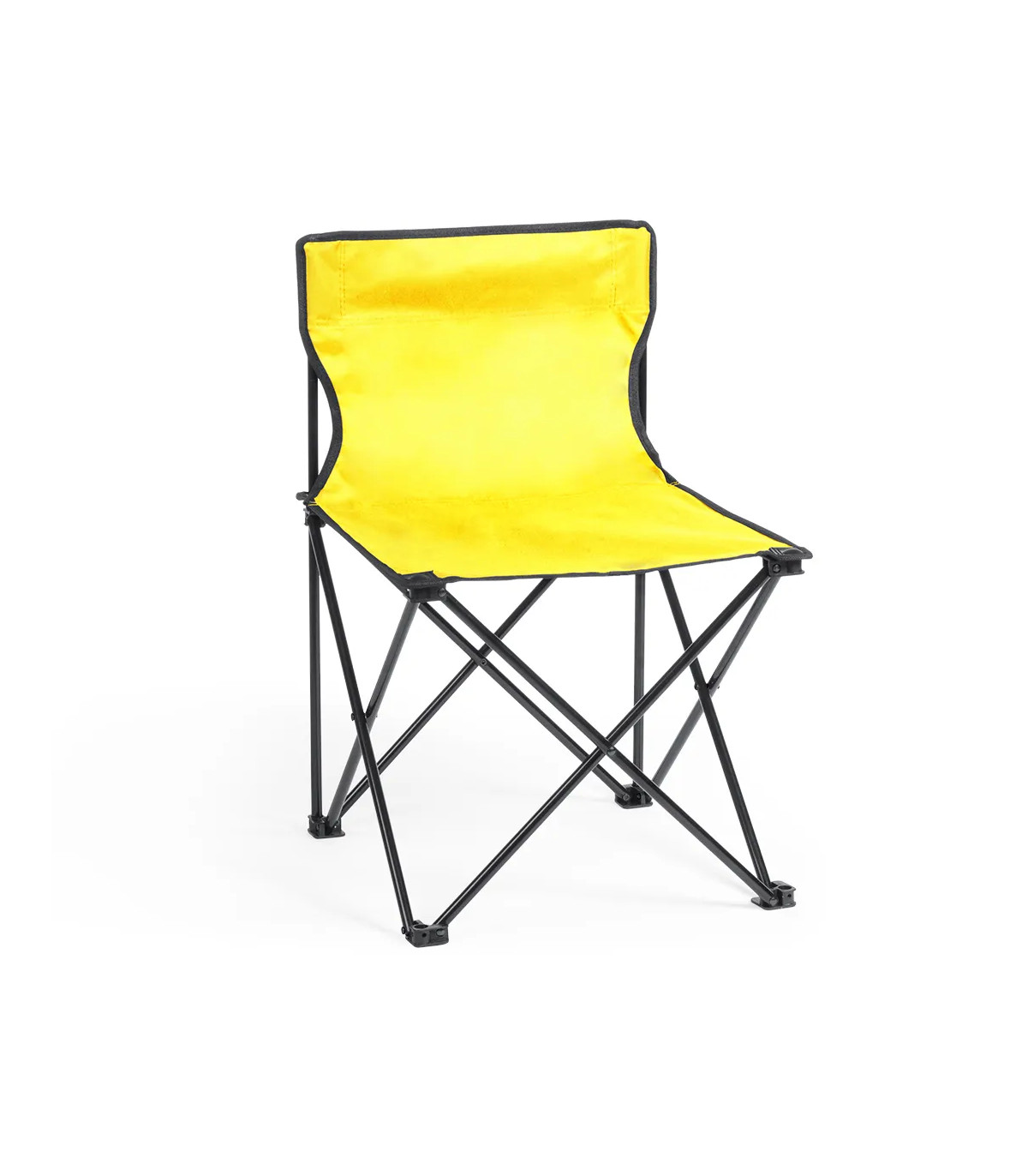Silla plegable con resistente cuerpo de aluminio tubular. En resistente poliéster 600D en variada gama de vivos colores. Con costuras reforzadas, refuerzos de goma antideslizantes en las patas y presentada en funda individual con cordón auto cierre, accesorio de ajuste y cinta para hombro.