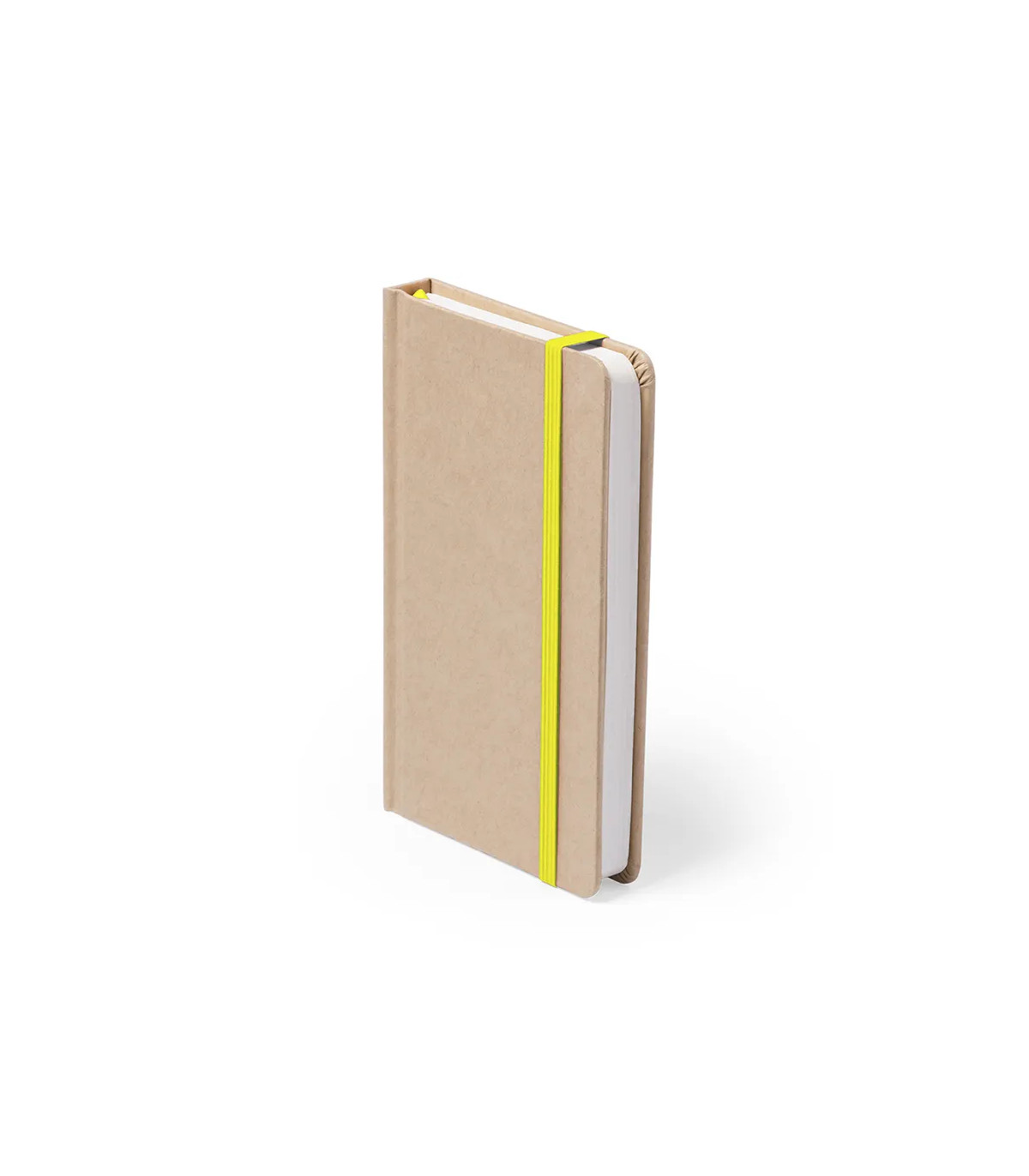 Bloc de notas con tapas de suave tacto acabadas en resistente cartón natural. De 100 hojas lisas, con elástico de sujeción y marcapáginas de tela a juego.