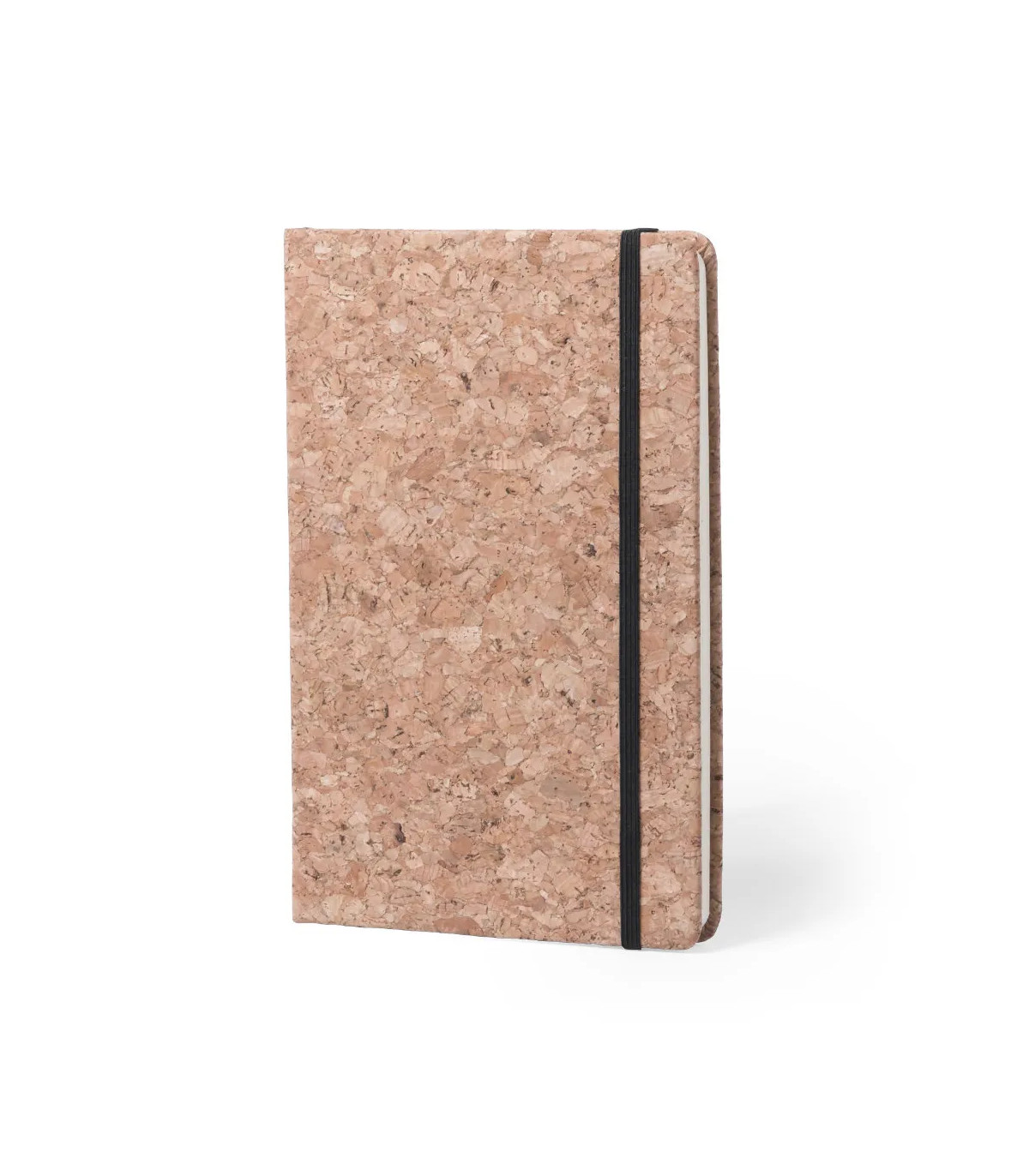 Bloc de notas ecológico en corcho natural y con tapas rígidas. De 80 hojas lisas con acabado natural, elástico de sujeción y marcapáginas de tela en sobrio color negro.