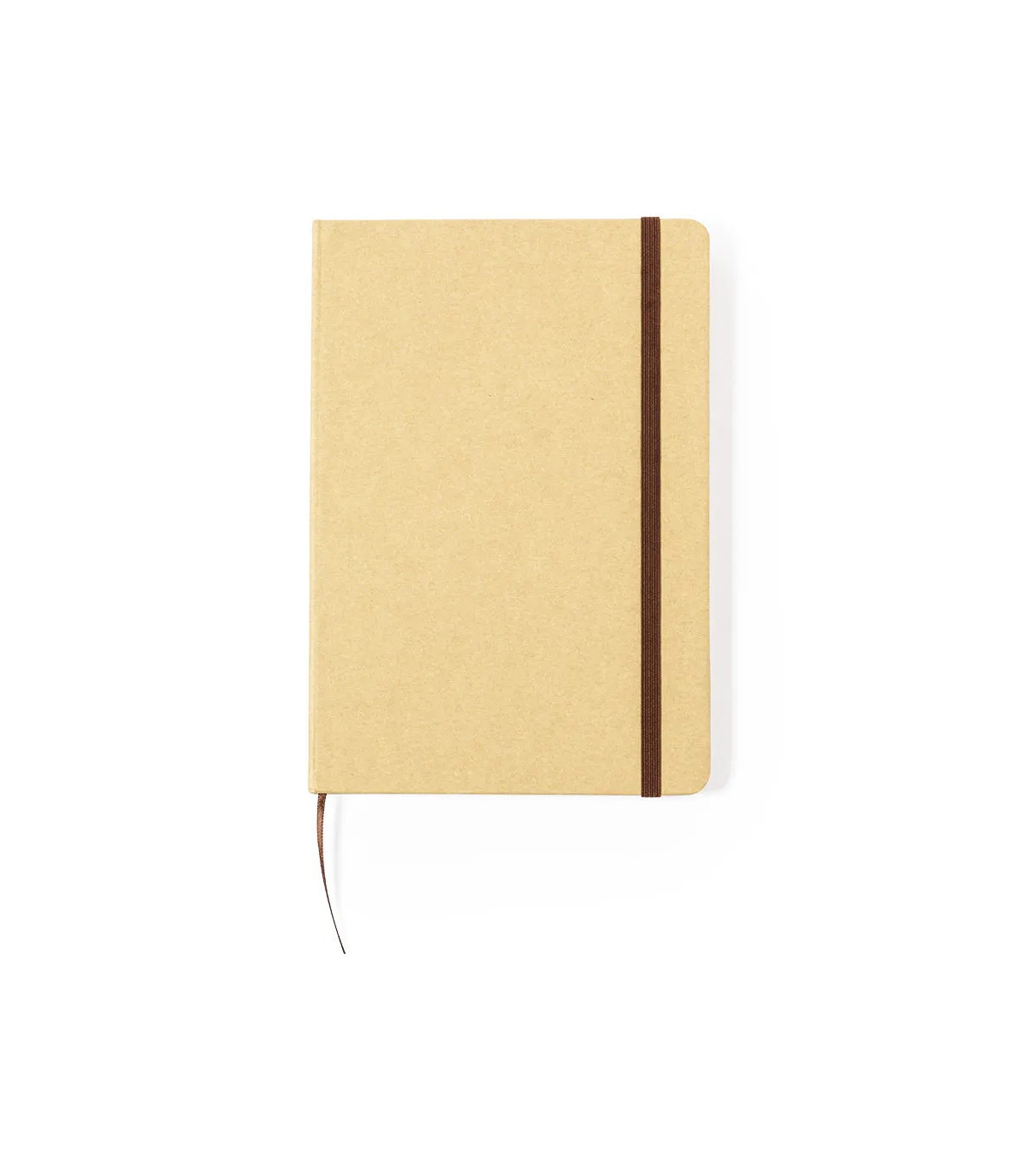 Bloc de notas A5 de línea nature, con tapas duras en resistente cartón reciclado. De 100 hojas lisas en acabado kraft con distintivo reciclado, con elástico de sujeción y marcapáginas de tela a juego.