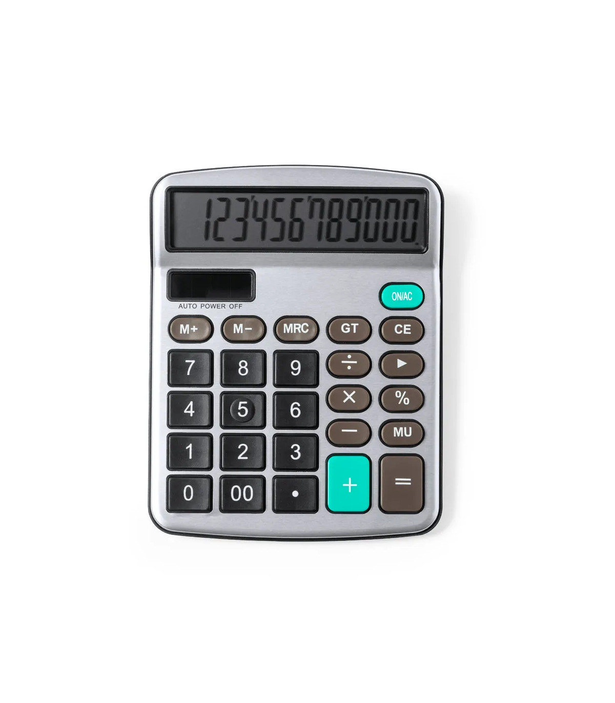 Calculadora de 12 dígitos fabricada en resistente aluminio y ABS, con teclas de tacto suave. Funcionamiento dual con energía solar y alimentación auxiliar con pila de botón (incluida, con film protector). Pantalla LCD y mecanismo de apagado automático. Presentada en caja individual de diseño kraft.
