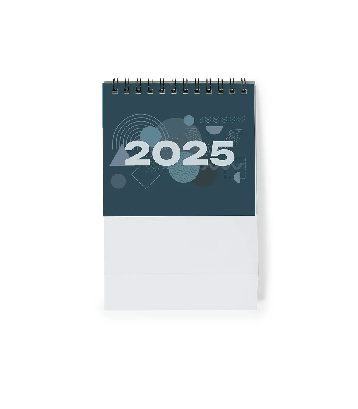Calendario de sobremesa de anillas con cuerpo triangular en cartón. Diseño mes en curso/ mes anterior/ mes siguiente y santoral. Amplia superficie de marcaje en ambas caras.