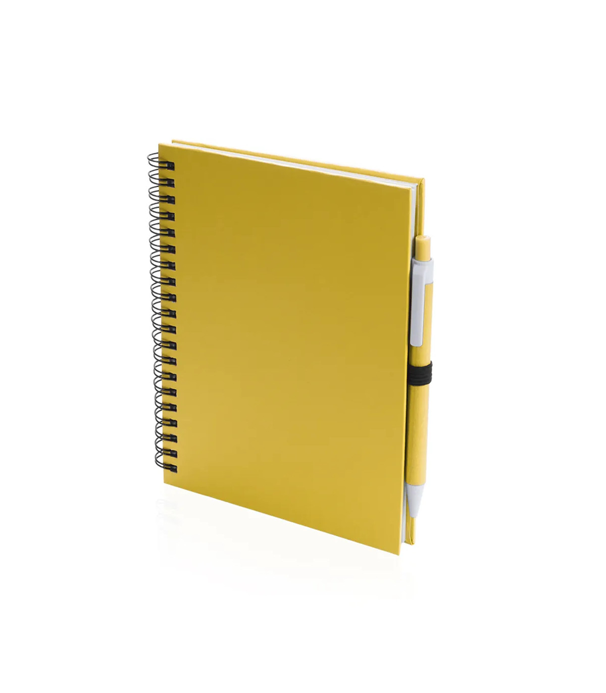 Libreta de anillas con tapas de suave tacto acabadas en resistente cartón reciclado y bolígrafo en cartón reciclado a juego. De atrevidos colores, 70 hojas lisas y con soporte para bolígrafo en contraportada.