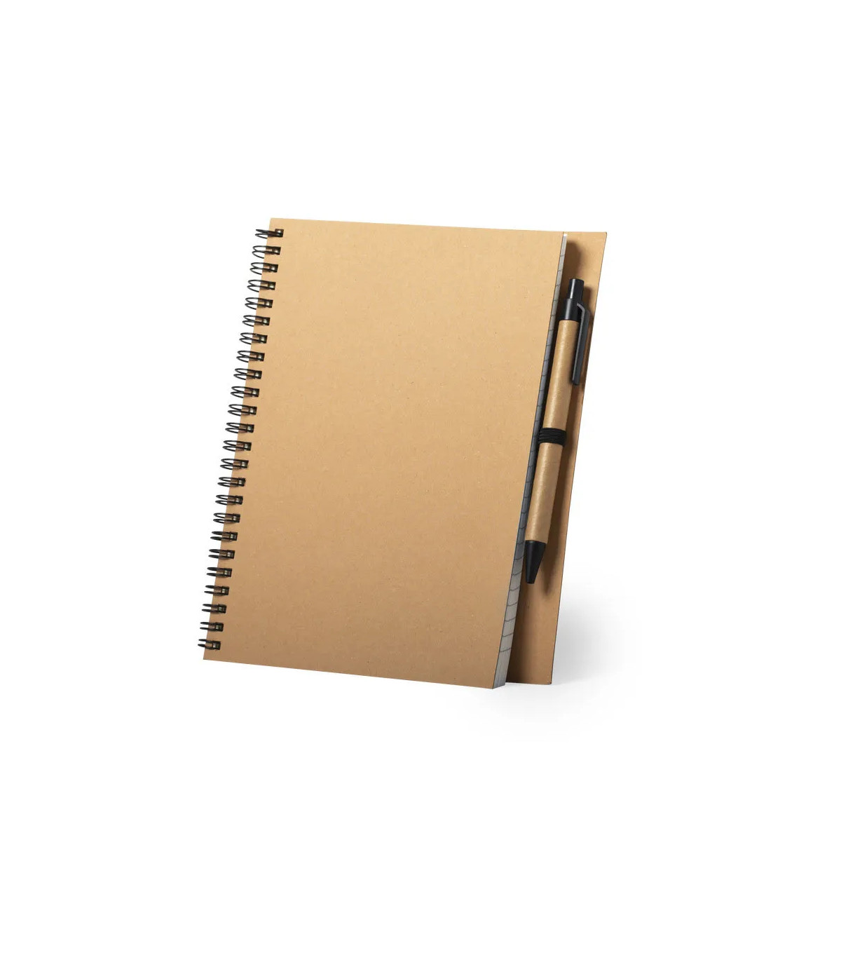 Set de libreta y bolígrafo en línea nature. Incluye libreta de anillas con tapas rígidas en cartón reciclado, con soporte para bolígrafo, 80 hojas de disposición a una raya y diseño eco. Bolígrafo de mecanismo pulsador, con cuerpo en cartón reciclado -tinta azul-.