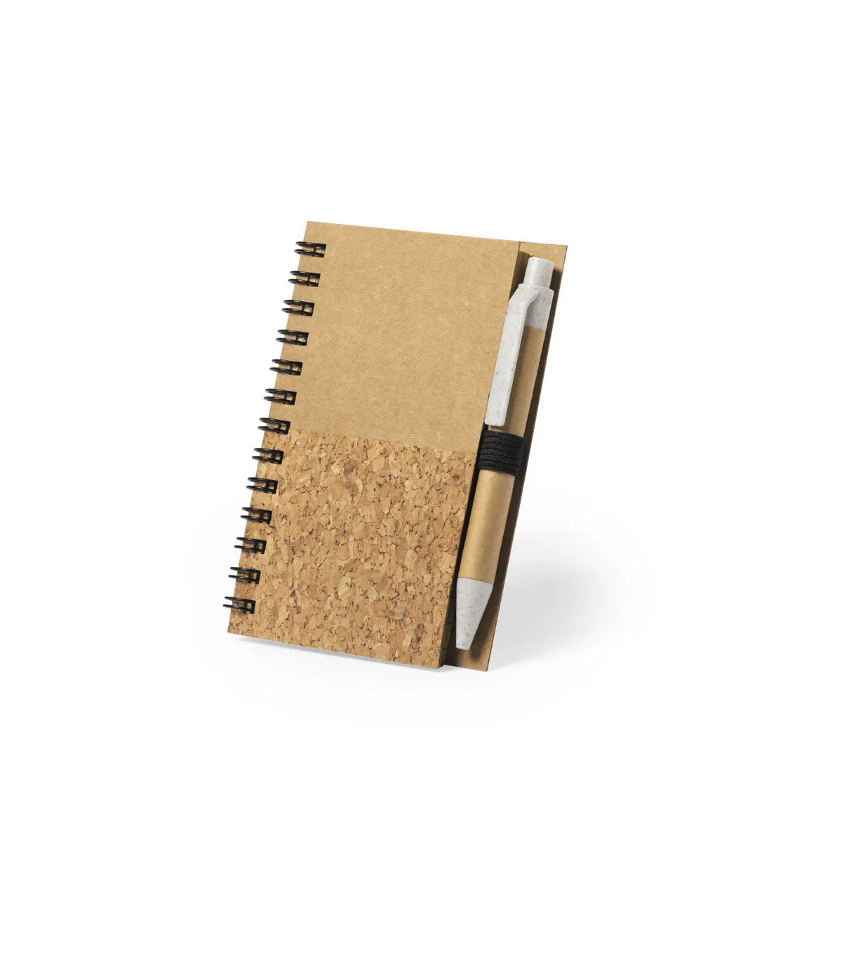 Set de libreta y bolígrafo en línea nature. Incluye libreta de anillas con tapas rígidas en corcho natural y cartón reciclado, con 80 hojas de disposición a una raya y diseño eco. Bolígrafo de mecanismo pulsador, con cuerpo en cartón reciclado y accesorio