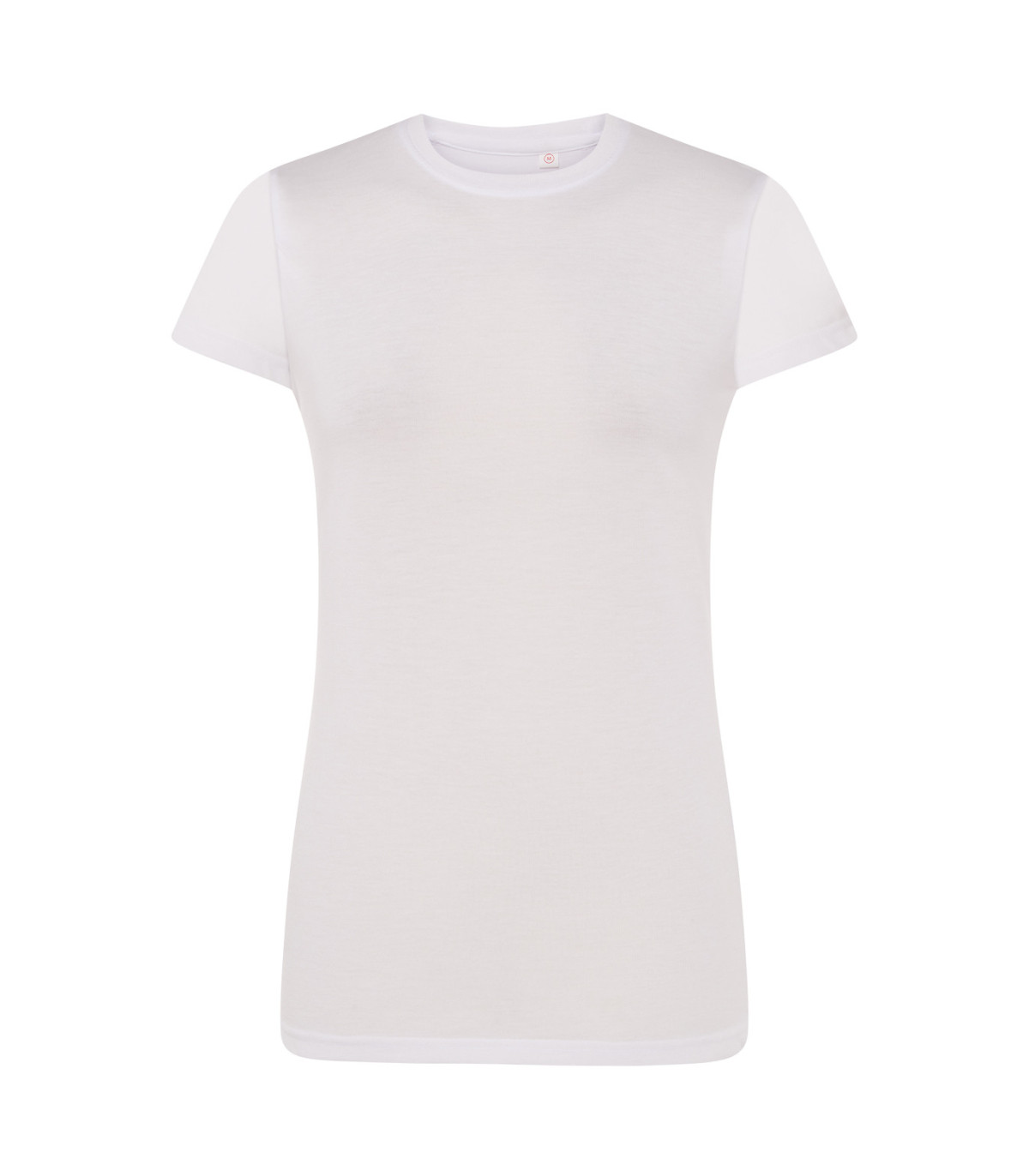 Camiseta demujer de manga corta para sublimar. 100% poliéster. Tacto de algodón. Etiqueta removible.Características:Doble costura en mangas y bajo.150 g/m²100% PoliésterEtiqueta removible