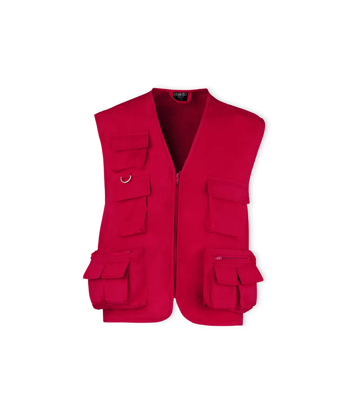 Chaleco en resistente combinación de materiales algodón y poliéster de vivos colores. Cierre de cremallera principal, multitud de bolsillos frontales y laterales de gran capacidad con cierre de velcro y anilla metálica en el pecho. Disponible en tallas L, XL, XXL.