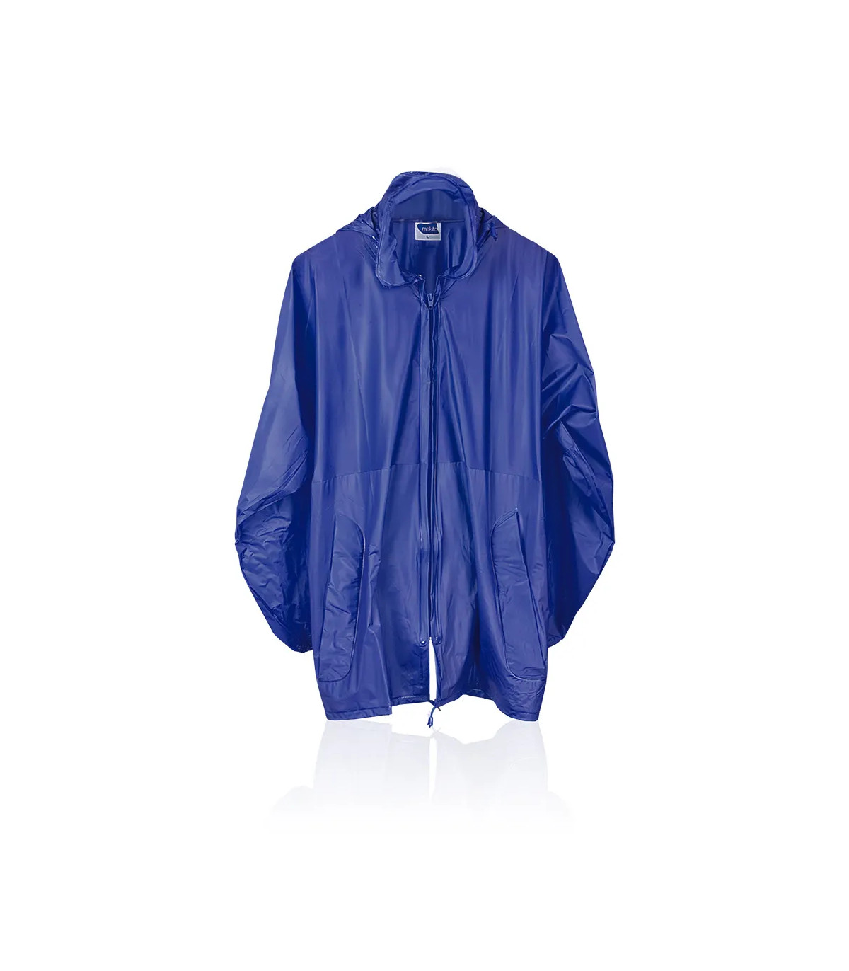 Impermeable en resistente PVC de acabado termosellado en variada gama de colores. Con capucha de cremallera integrada en cuello, cierre principal de cremallera y con bolsillos laterales. Convertible en riñonera con cintas elásticas y cierre de buckle a juego. Disponible en tallas M-L, XL-XXL.