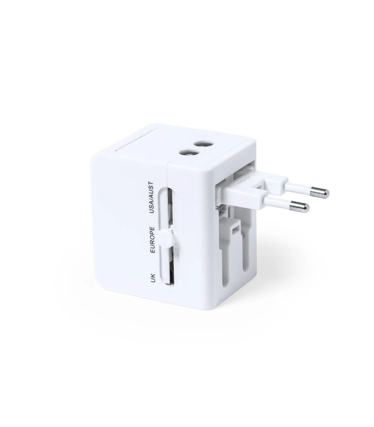 Adaptador de enchufes retráctil, de diseño ultra compacto y de elegante acabado en color blanco. Con salida USB QC 3.0 (Quick Charge/ Carga Rápida) 18W y salida tipo C 20W, con tecnología de carga rápida PD (Power Delivery), compatible con multitud de dispositivos. Especialmente indicado para viajeros, incluye adaptadores multi región para USA, Europa, Asia, Reino Unido y Australia. Con funda de transporte de antelina y presentado en caja individual de diseño kraft.