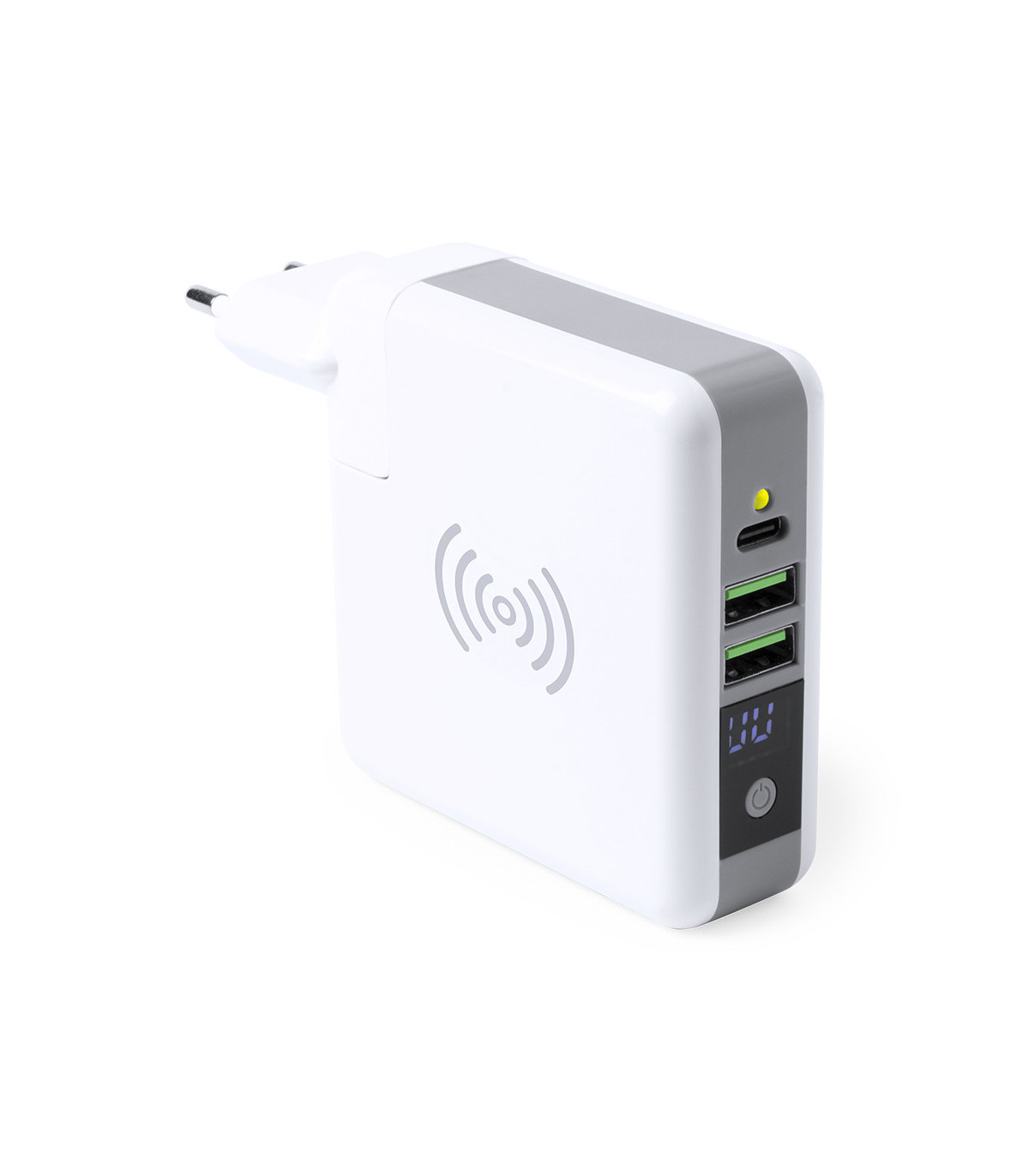 Adaptador viaje inalámbrico, multifunción y multisalida con powerbank integrado de 6.700 mAh de capacidad de carga. De elegante diseño en color blanco y amplia superficie de marcaje. Función de carga inalámbrica, conexión dual de entrada y salida de corri