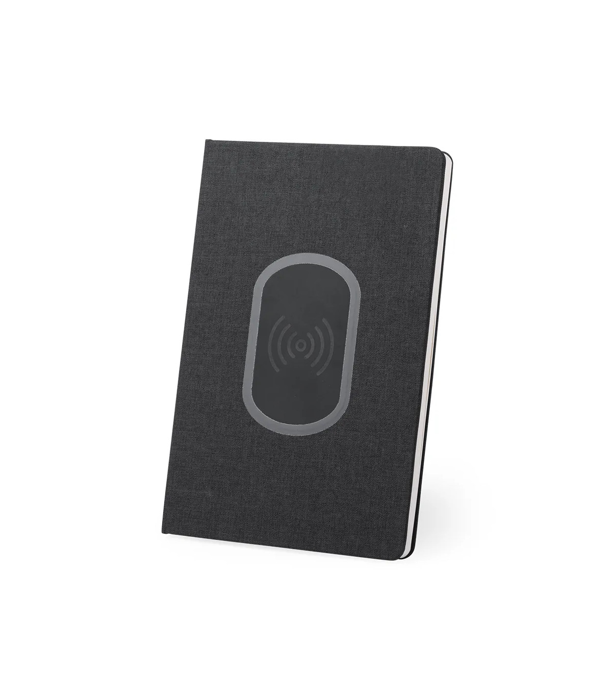 Bloc de notas cargador en resistente poliéster 300D con cargador inalámbrico integrado. De sobrio diseño y original estación de carga en la portada. Incluye 80 hojas con disposición a una raya.