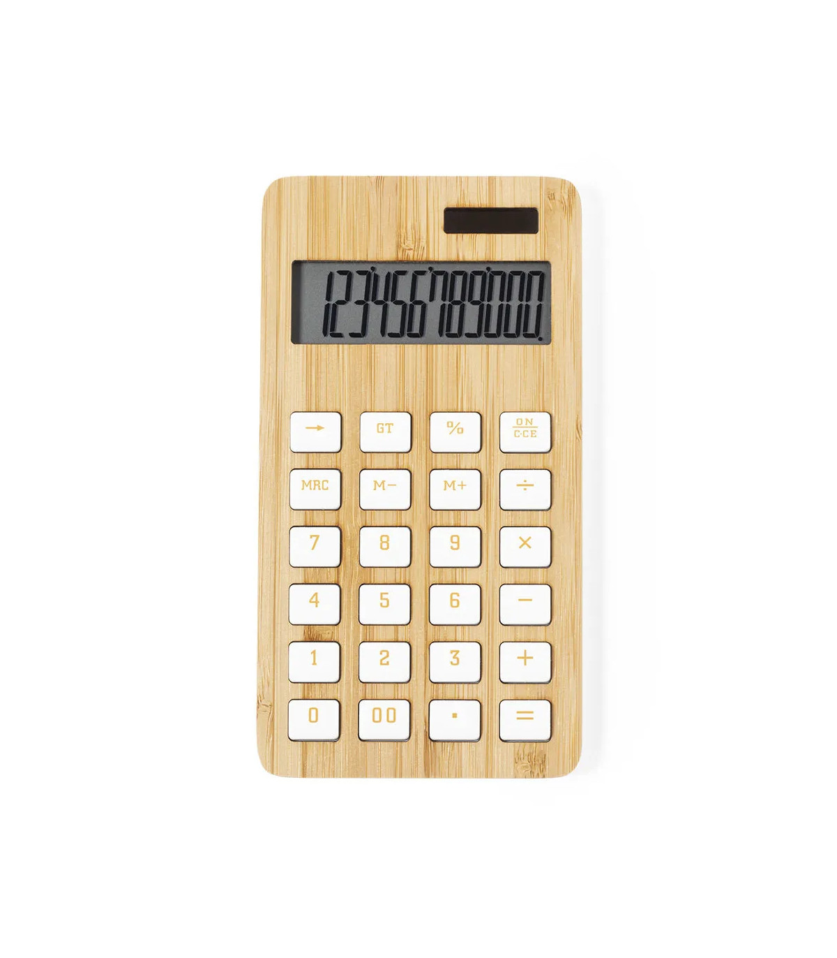 Calculadora de 12 dígitos de línea nature y fabricada en bambú. Funciona con energía solar, con alimentación auxiliar a pilas de botón (incluida). Con mecanismo de apagado automático y suaves teclas de silicona. Presentada en atractiva caja de diseño eco,