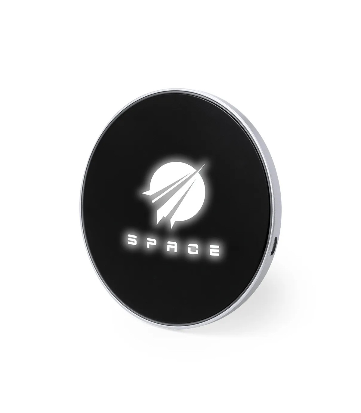 Cargador inalámbrico circular. En elegante color negro, con luz led interior y un recubrimiento exterior especialmente diseñado para marcaje en láser, con el que conseguirá que su publicidad o marca quede iluminada con luz blanca. Base antideslizante y compatible con dispositivos equipados con tecnología de carga inalámbrica. Presentado en atractiva caja de diseño. Cable USB incluido.