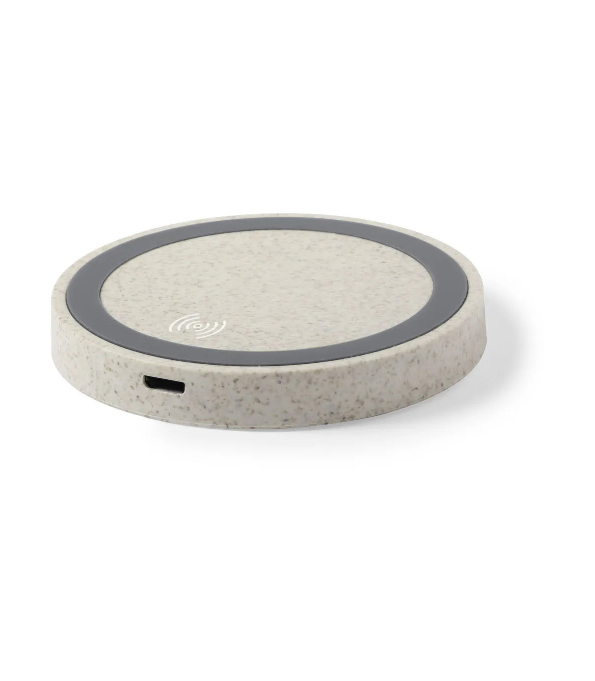 Cargador inalámbrico circular de línea nature. Carcasa en caña de trigo, para así fomentar la utilización de materias primas naturales y reducir las emisiones contaminantes. Con base antideslizante e indicador LED de estado de carga. Compatible con smartphones con tecnología de carga inalámbrica y presentado en atractiva caja de diseño eco.