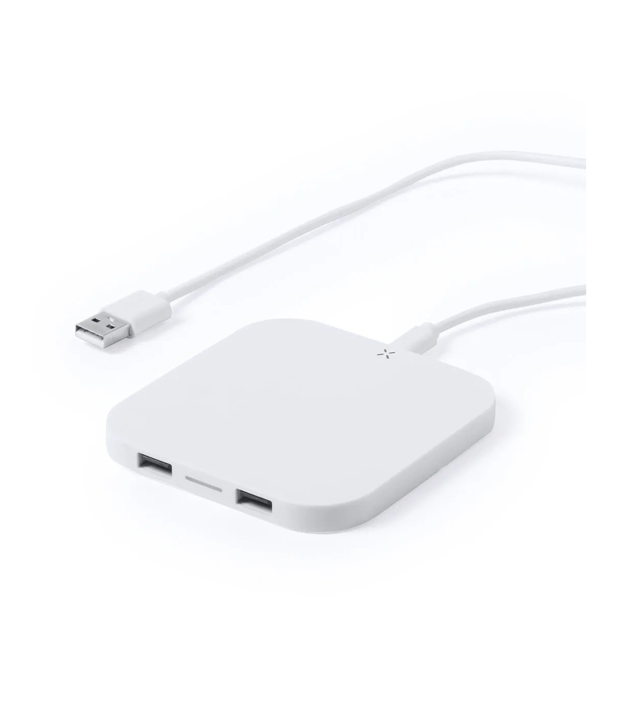 Cargador inalámbrico de diseño minimalista en color blanco. Con salida USB dual extra de 2.100 mA de capacidad para carga simultánea de dos dispositivos. Con base antideslizante. Compatible con dispositivos equipados con tecnología de carga inalámbrica y presentado en atractiva caja de diseño.