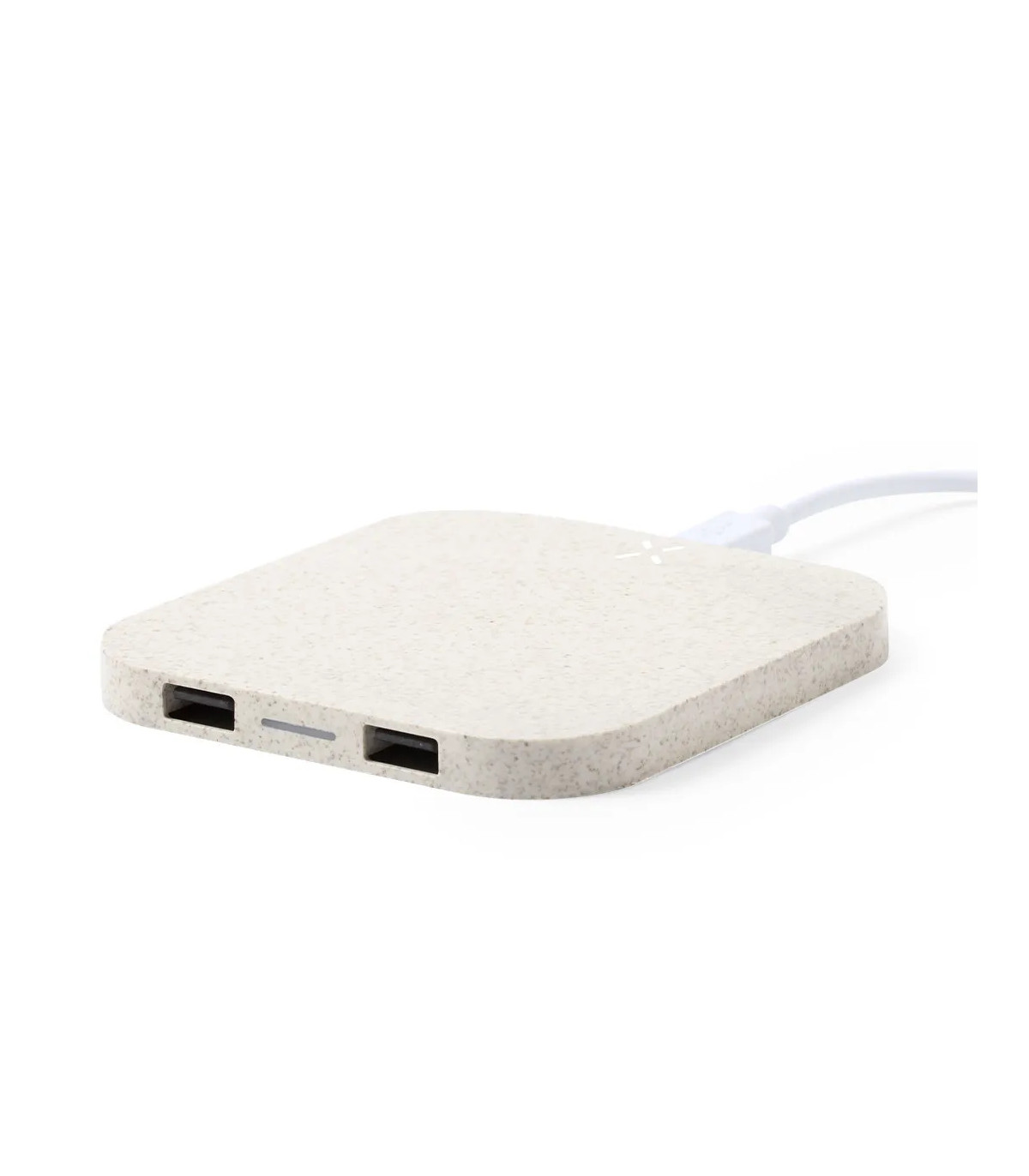 Cargador inalámbrico de línea nature. Carcasa en caña de trigo, para así fomentar la utilización de materias primas naturales y reducir las emisiones contaminantes. Con salida USB dual de 2.100 mA de capacidad para carga simultánea de hasta 3 dispositivos (1 por carga inalámbrica y 2 por cable). Base antideslizante y compatible con dispositivos equipados con tecnología de carga inalámbrica. Presentado en atractiva caja de diseño eco.