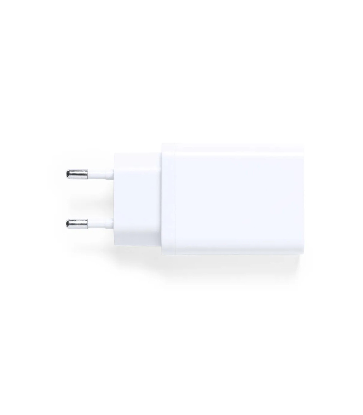 Cargador USB de pared con carga rápida, fabricado en resistente ABS. Salida USB y Tipo C. Enchufe europeo y presentado en atractiva caja individual de diseño.
