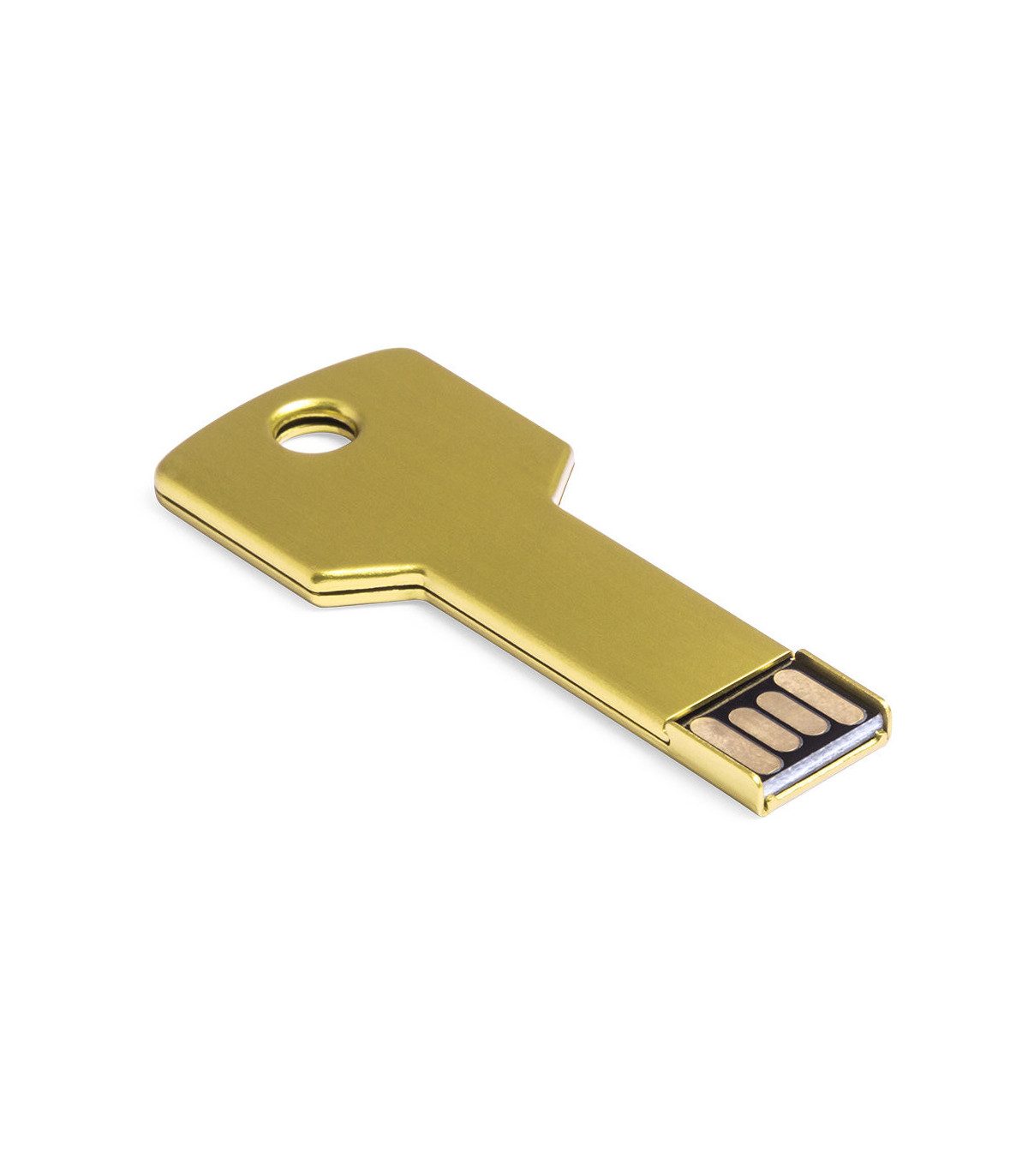 Memoria USB en forma de llave de 16GB de capacidad, de acabado en aluminio brillante y diseñada para llevar en el llavero. Presentada en estuche individual metálico con ventana y suave espuma troquelada.