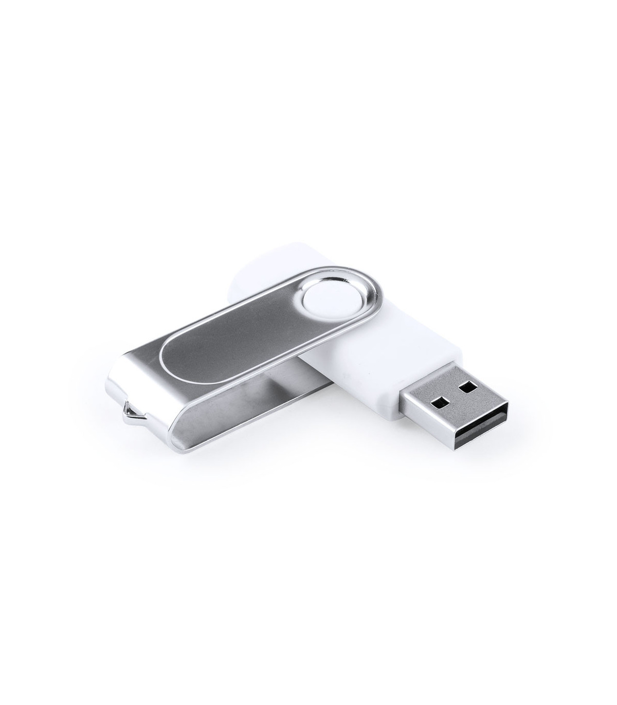 Memoria USB de 16GB de capacidad, mecanismo giratorio y en elegante acabado de color blanco. Con cuerpo troquelado, especialmente diseñado para marcaje en doming/gota de resina. Presentada en estuche individual con ventana.