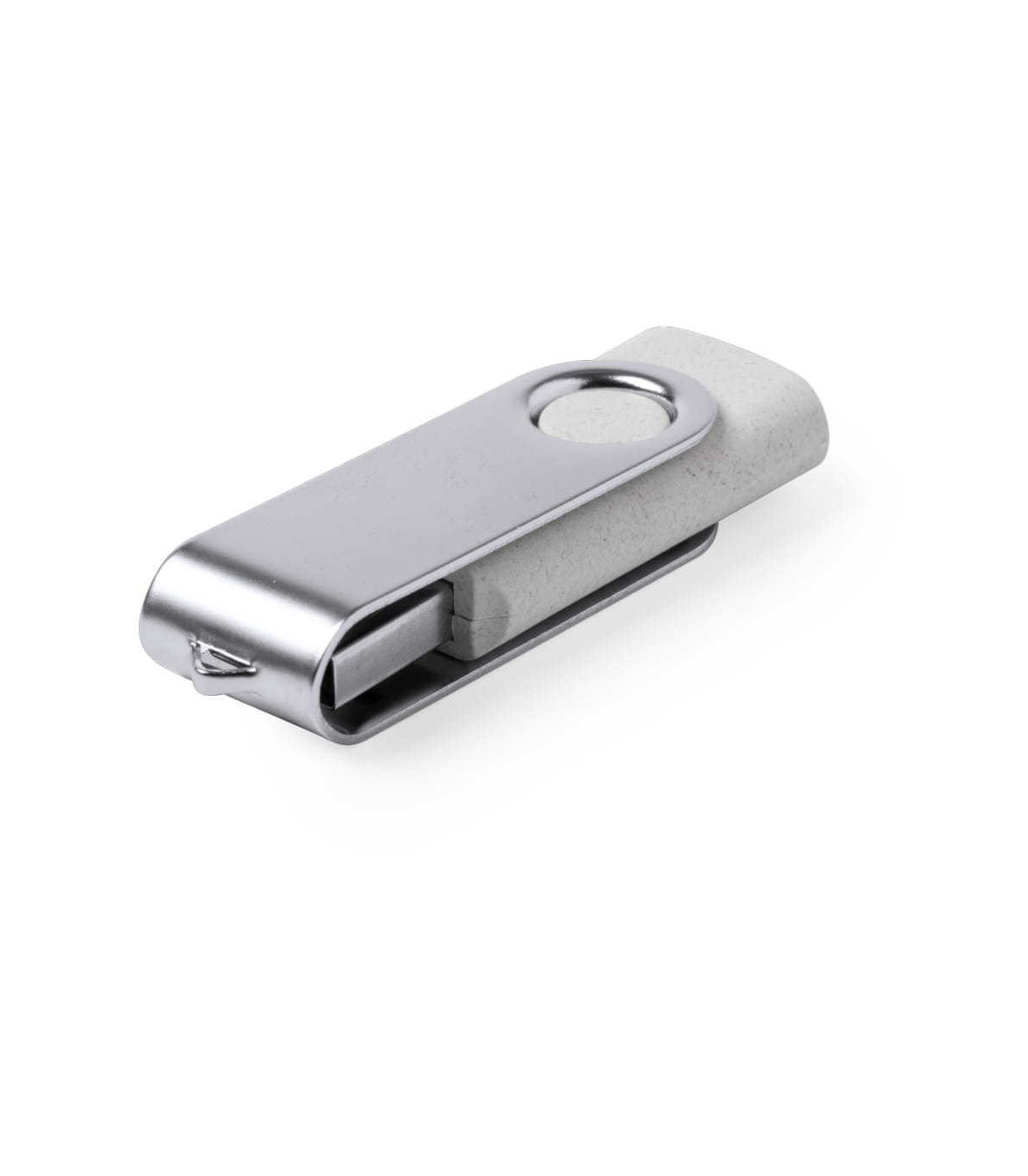Memoria USB de 16GB de capacidad en línea nature. Cuerpo en caña de trigo, para así fomentar la utilización de materias primas naturales y reducir las emisiones contaminantes y clip metálico de mecanismo giratorio. Presentada en estuche individual de dise