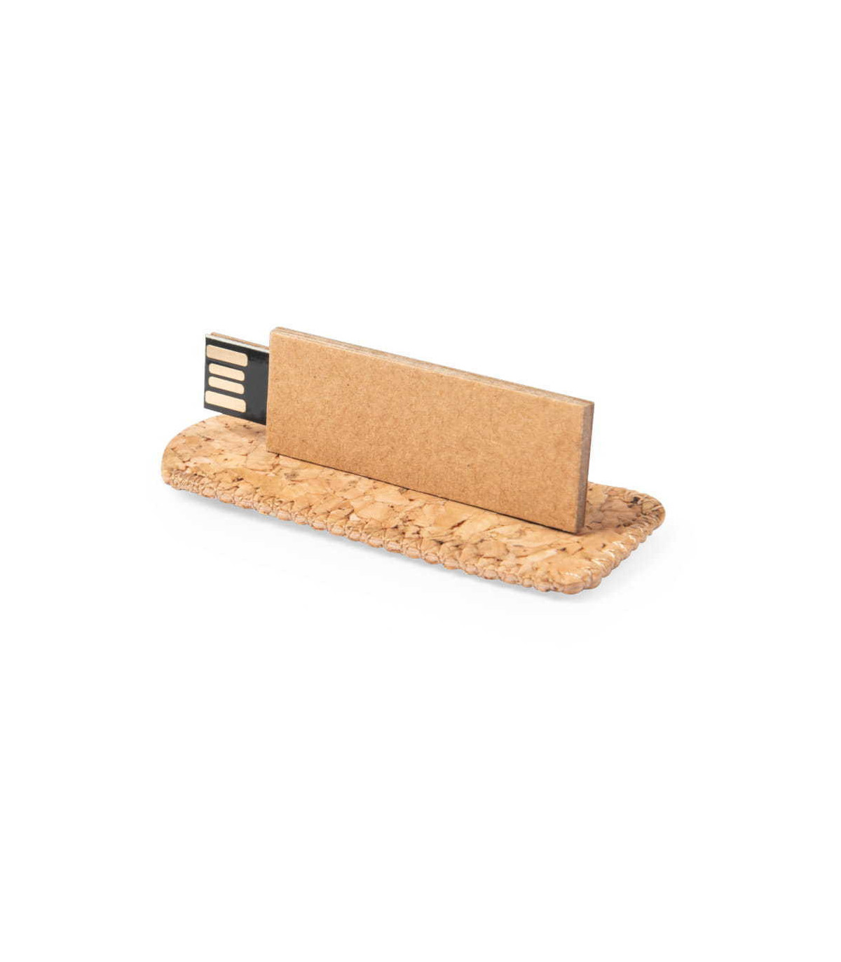 Memoria USB de 16GB de capacidad en línea nature. Cuerpo en cartón reciclado, presentada en una funda de corcho natural y en estuche individual de diseño eco.