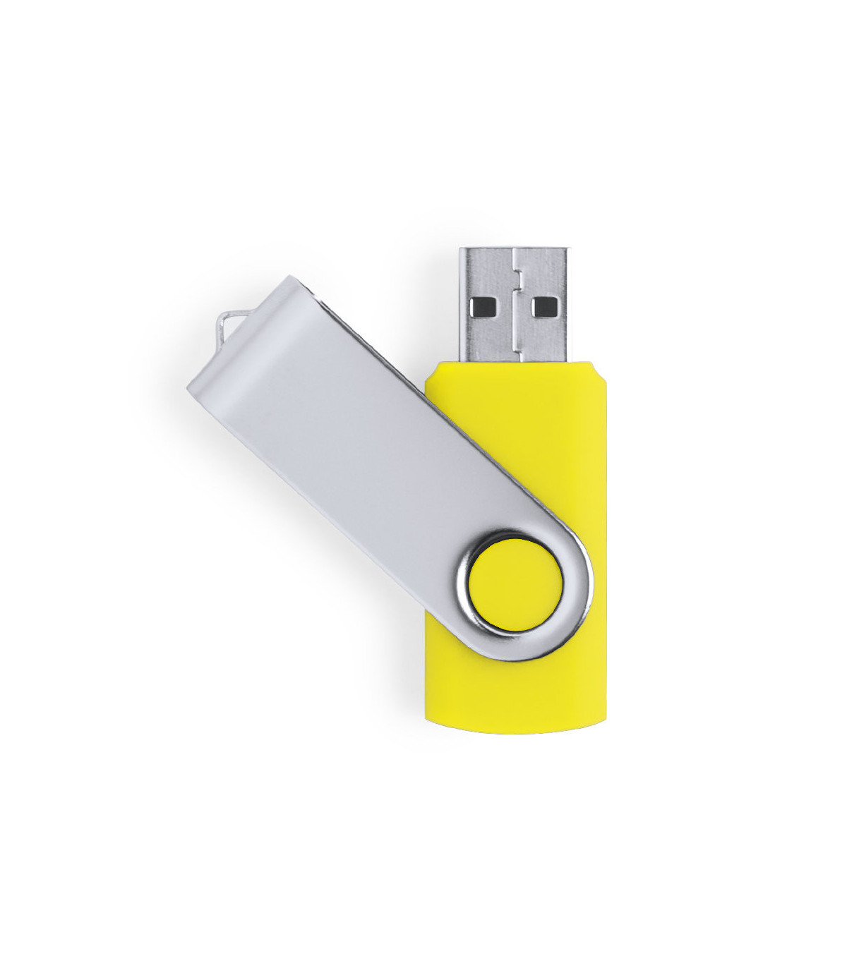 Memoria USB de 32GB de capacidad, con mecanismo giratorio, cuerpo de suave acabado y clip metálico. Presentada en estuche individual.
