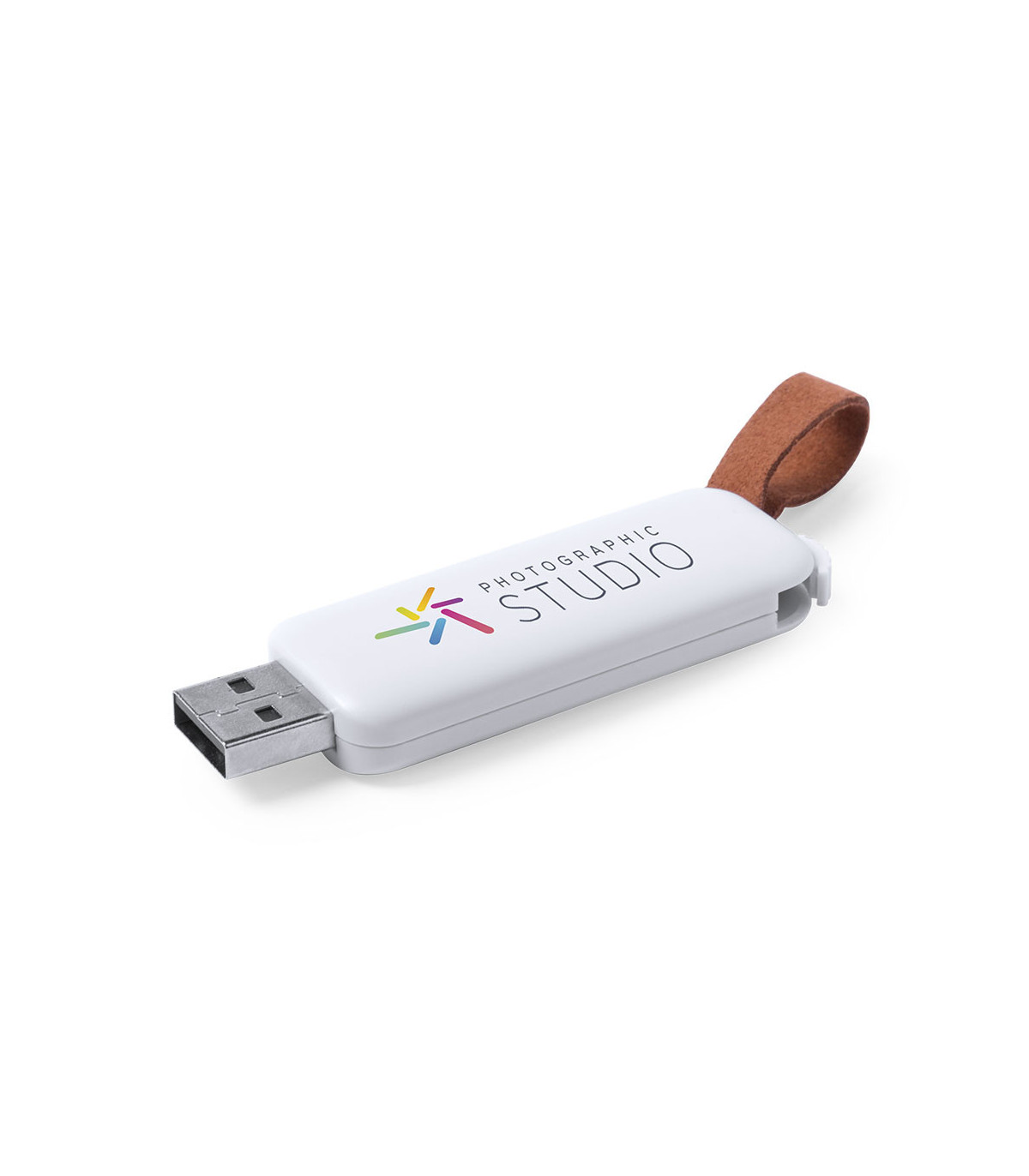 Memoria USB de 16GB de capacidad con diseño minimalista en color blanco. Especialmente diseñada para impresión digital, con mecanismo retráctil y cinta de piel. Presentada en estuche individual.