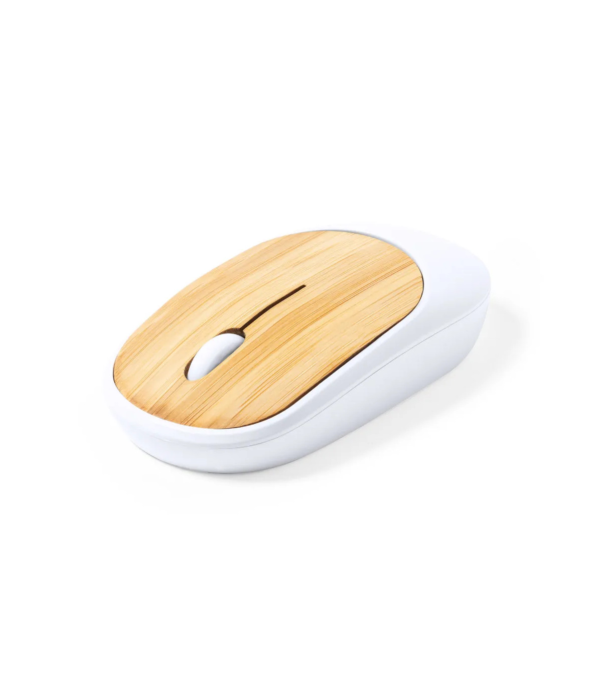 Ratón óptico inalámbrico de línea nature y con diseño ergonómico. Fabricado en resistente ABS de color blanco con superficie en bambú. Alimentación a pilas: 1xAA no incluida. Presentado en caja individual de diseño kraft.