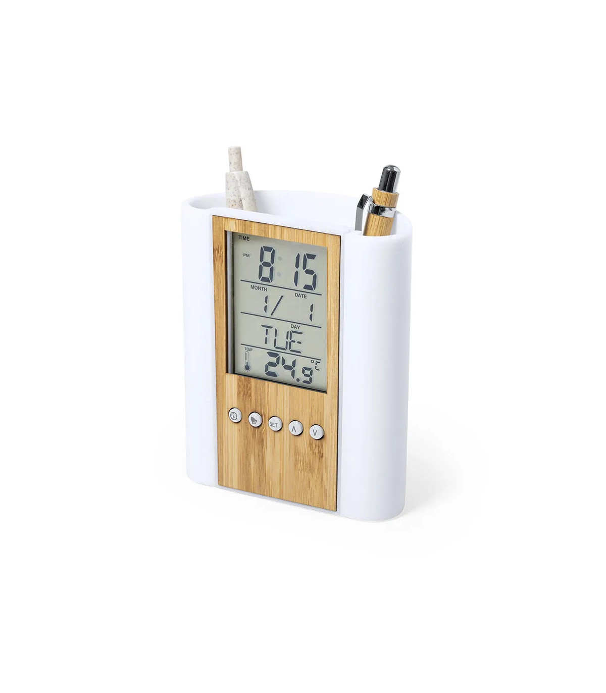 Reloj radio de línea nature con frontal en bambú. Funciones alarma, calendario, termómetro y radio FM, con antena retráctil. Alimentación a pilas (2xAAA no incluidas) y presentado en atractiva caja de diseño eco.