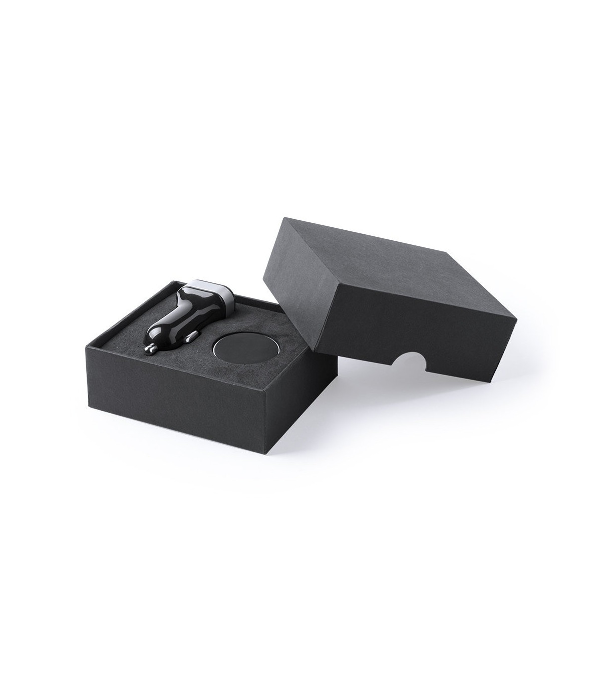 Set de cargador para coche y soporte para smartphone. Incluye cargador USB de 2.000 mAh de capacidad de carga en diseño minimalista de color negro. Con salida USB dual que permite la carga simultánea de dos dispositivos móviles. Soporte magnético de acople en rejilla para smartphone, con accesorio adhesivo. Presentado en caja individual con interior de espuma troquelada.