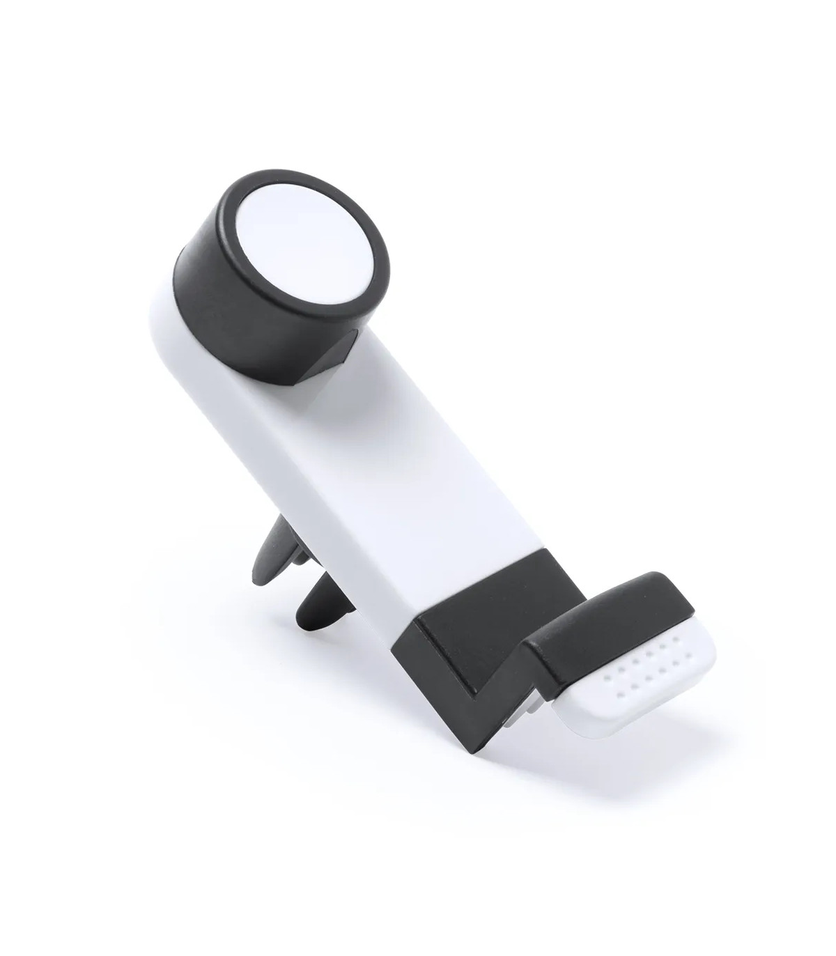 Soporte para smartphone de diseño minimalista y elegante acabado bicolor en blanco y negro. Con sistema de fijación para rejilla de ventilación del automóvil y pastilla circular frontal especialmente diseñada para marcaje en tampografía.