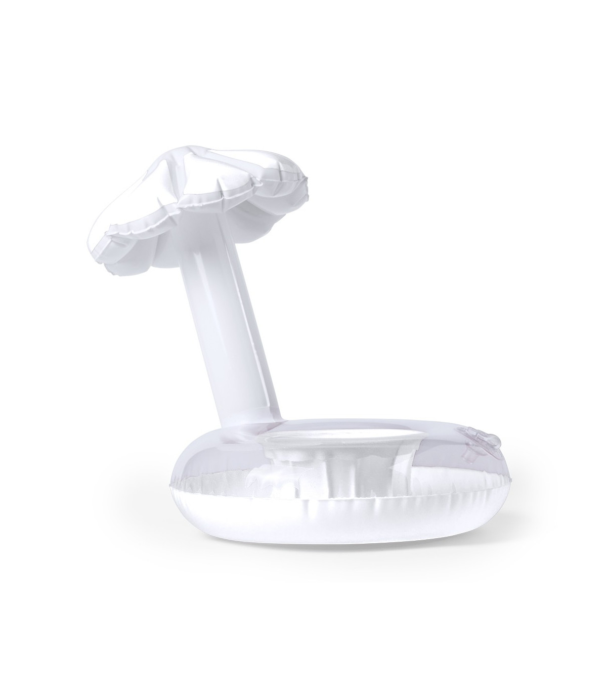 Original soporte inflable para bebida en forma de flotador con sombrilla de playa. Con suave cuerpo acabado en PVC de vivos colores y presentado con plegado especial para impresión.